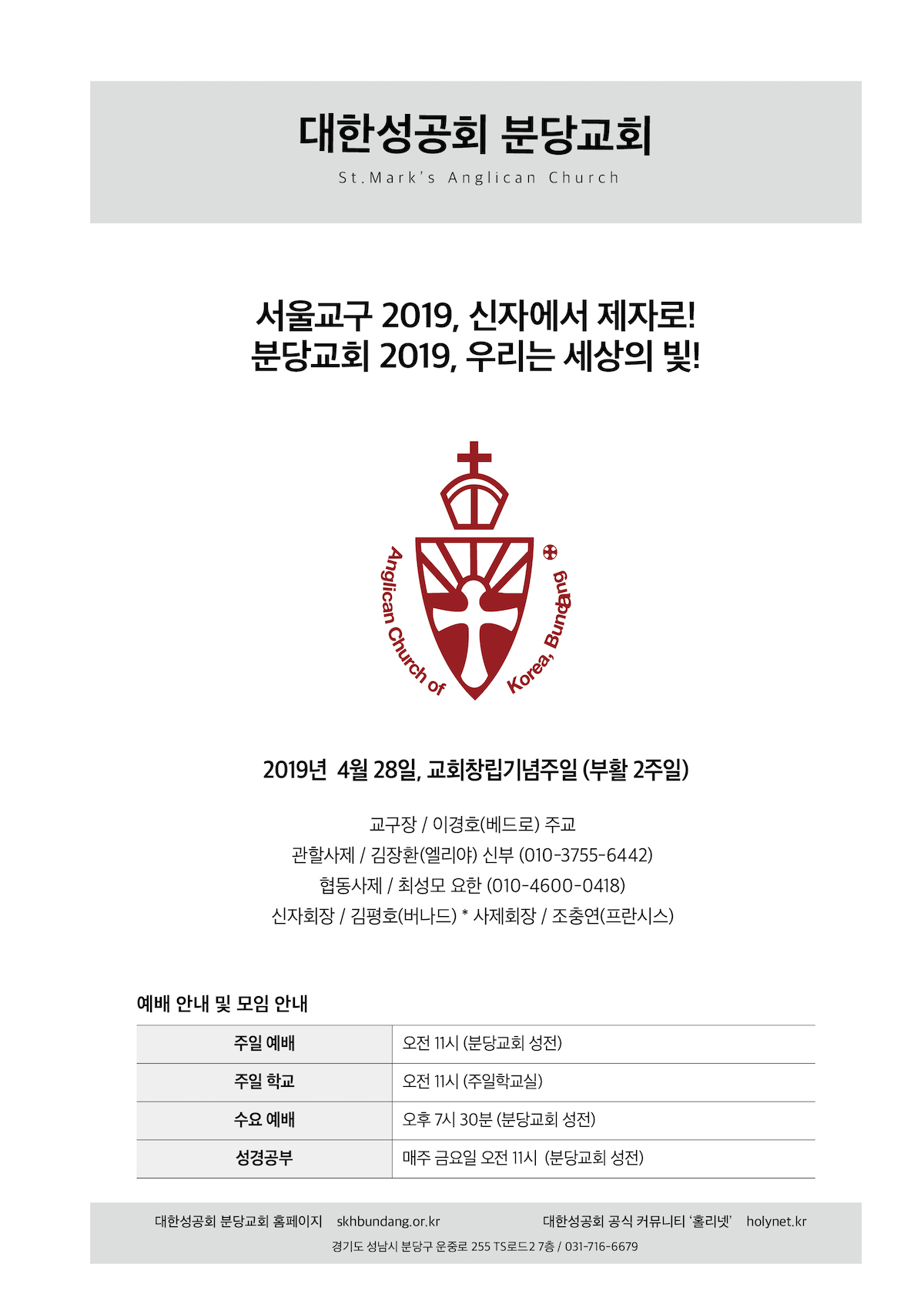 교회 주보 교회창립기념주간, 부활2주일 by 분당교회 2019. 4. 28. 4월 28일 교회창립기념주간 부활 2주일 <표지> <분당교회 기도문> <광고> <전례> <교회창립기념주일 행사 안내> 공유하기 게시글 관리 대한성공회 분당교회 '교회 주보' 카테고리의 다른 글 부활 4주일 (0) 2019.05.12 가정주일(부활3주일) (0) 2019.05.05 부활주일 (0) 2019.04.21 고난주일 (0) 2019.04.15 사순 5주일 (0) 2019.04.07 관련글 부활 4주일 가정주일(부활3주일) 부활주일 고난주일 댓글