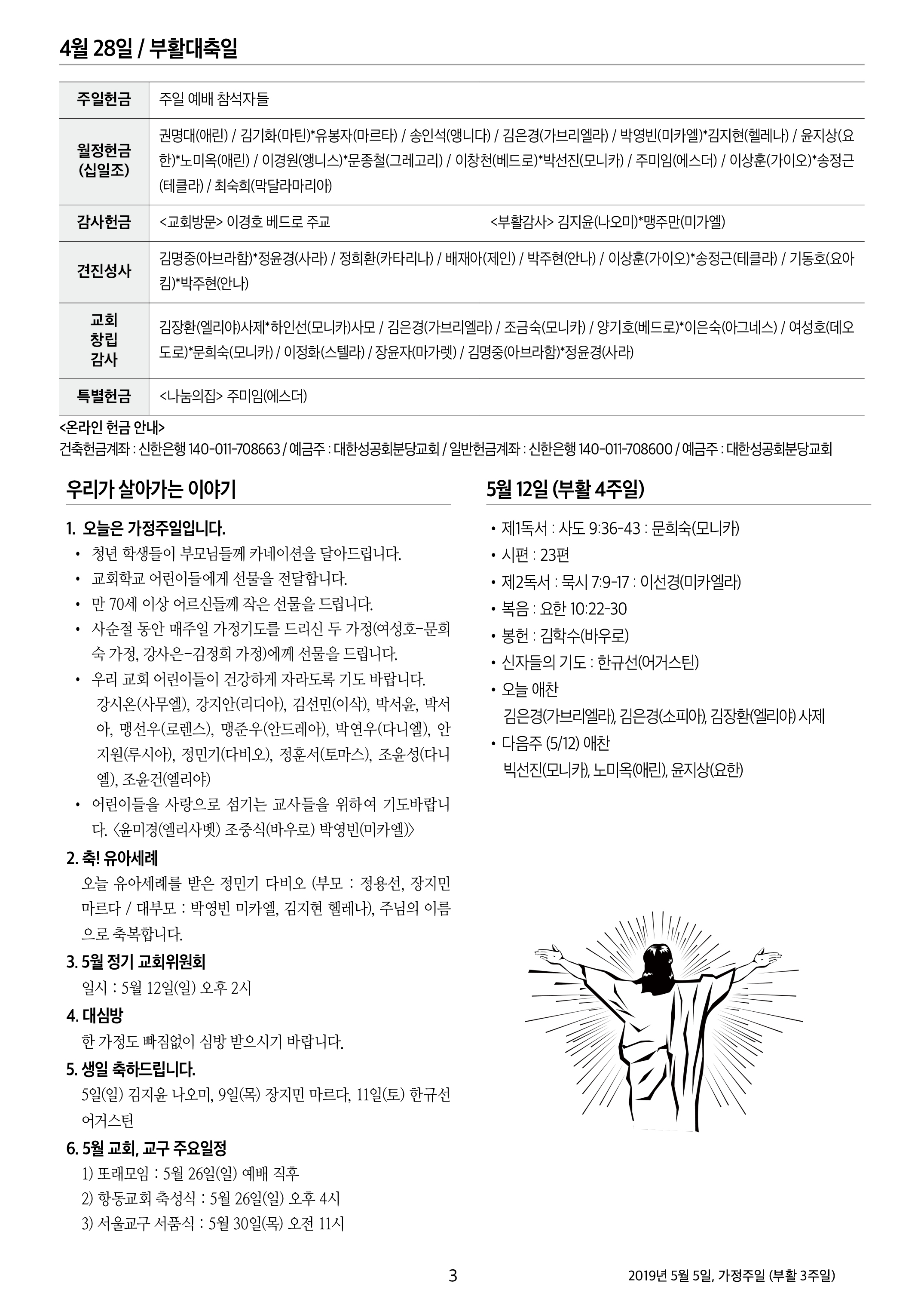 교회 주보 가정주일(부활3주일) by 분당교회 2019. 5. 5. 5월 5일 가정주일 부활 3주일 <표지> <신앙탐구> <광고> <전례> 공유하기 게시글 관리 대한성공회 분당교회 '교회 주보' 카테고리의 다른 글 부활5주일 (0) 2019.05.19 부활 4주일 (0) 2019.05.12 교회창립기념주간, 부활2주일 (0) 2019.04.28 부활주일 (0) 2019.04.21 고난주일 (0) 2019.04.15 관련글 부활5주일 부활 4주일 교회창립기념주간, 부활2주일 부활주일 댓글