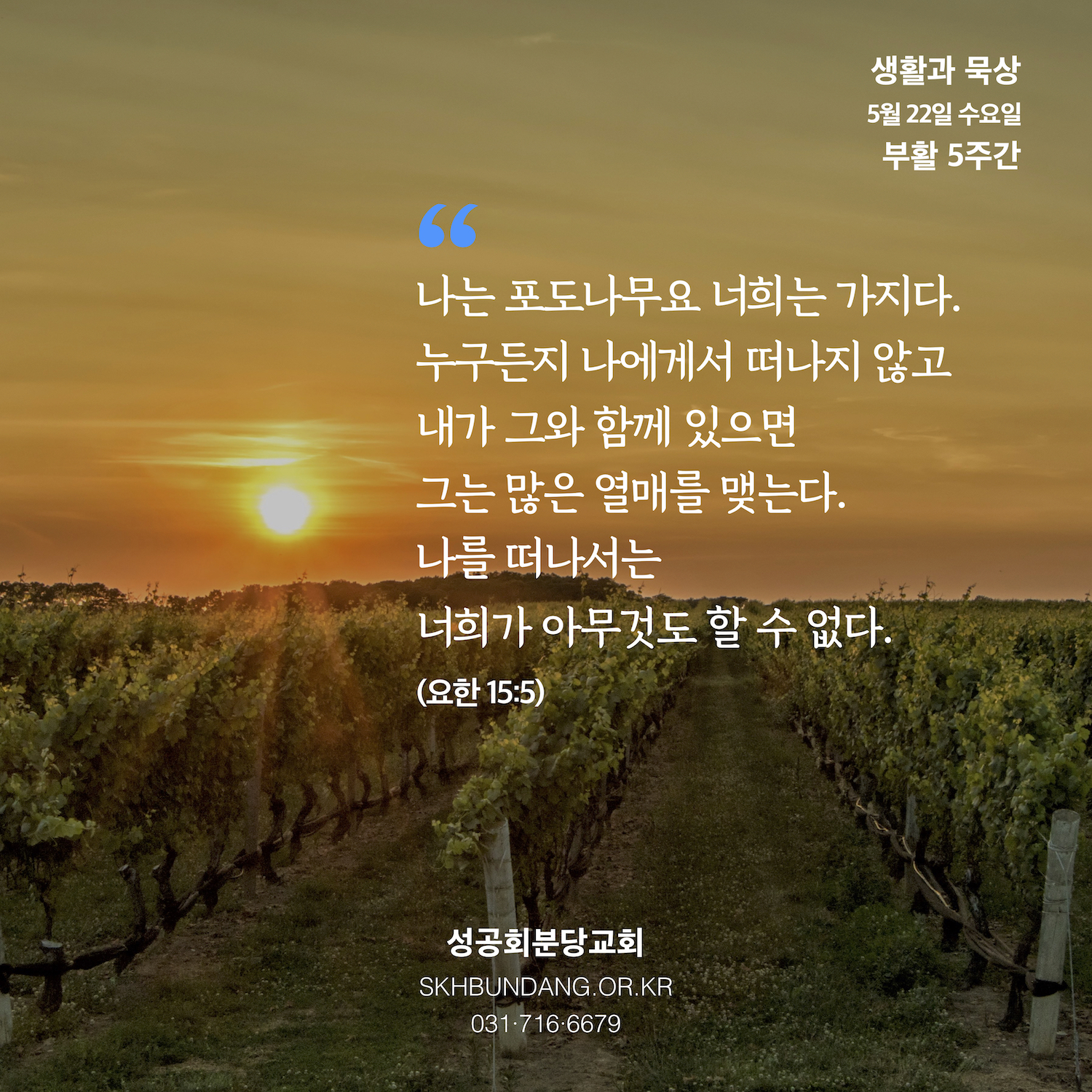 5 나는 포도나무요 너희는 가지다. 누구든지 나에게서 떠나지 않고 내가 그와 함께 있으면 그는 많은 열매를 맺는다. 나를 떠나서는 너희가 아무것도 할 수 없다.
