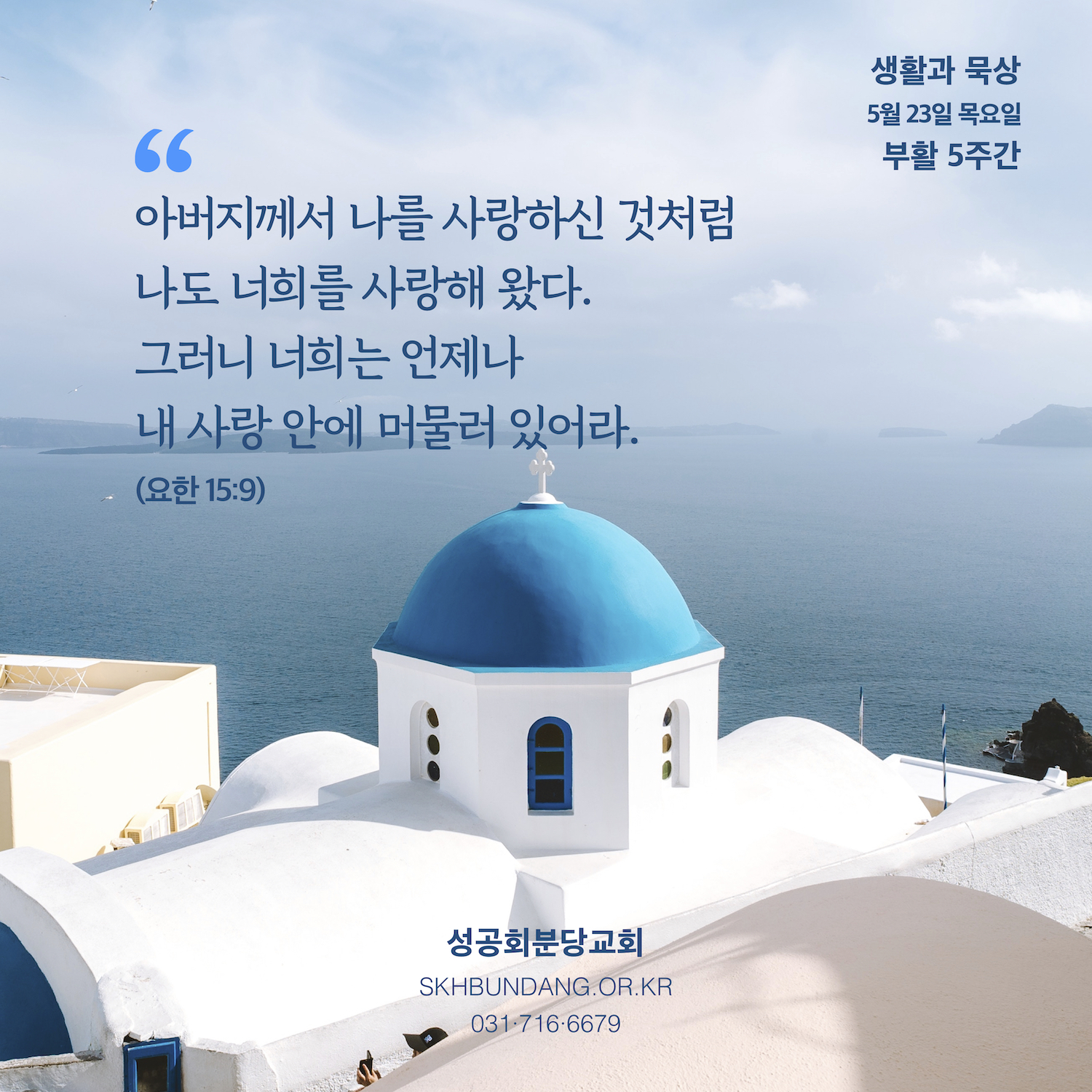 특별히 그리스도인으로서 살아간다는 것은 계명이라는 특정 공간 속에 머물며 하늘나라를 지향하고, 그 복음을 증거하는 사람이라 말할 수 있을 것입니다. 그러기에 예수계서는 오늘 복음서에서 당신의 사랑 안에 머물러 있으라고 말씀하십니다. 그 사랑 안에 머문다는 것은 무엇일까요. 바로 주님을 사랑하고 이웃을 내 몸같이 사랑하라는 계명을 지키는 것 아닐까요. 오늘, 제 삶의 경험 속에서 체험했던 머무는 것에 대한 중요성을 되새기며, 신앙인으로서 주님의 사랑 안에 항구히 머물 수 있는 삶이 되도록 의식하며 노력해 나가고 싶습니다.