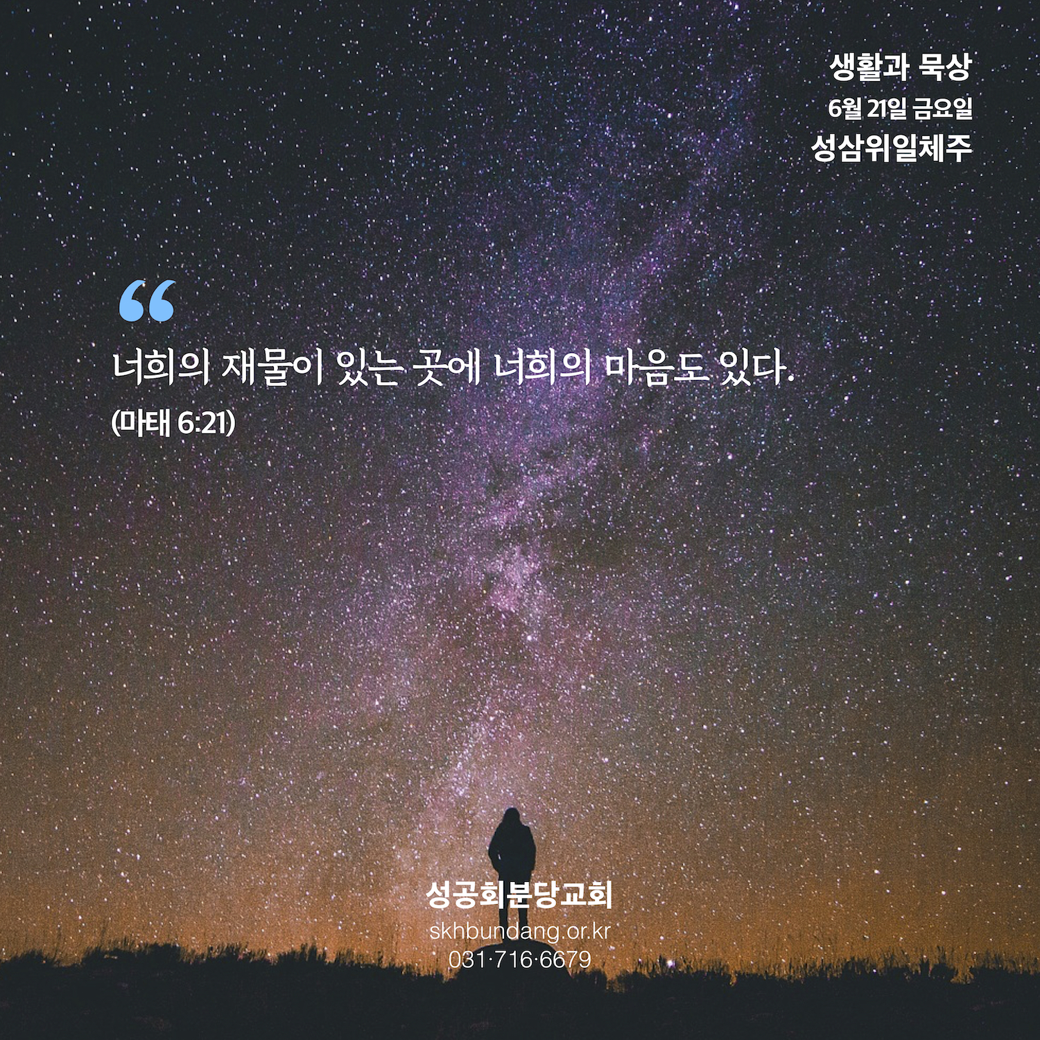 말씀을 가슴에 품고, 말씀에 침잠해서 가만히 앉아있으면, 어느새 어둠은 사라지고 본래의 맑은 마음이 드러납니다. 불안과 두려움과 염려의 그림자에 겁먹고 짓눌려서 못 보던 사랑과 진실을 대면하게 됩니다. 그렇게 하늘에 재물을 쌓아갑니다. 하늘은 또한 마음의 근원이기도 합니다.