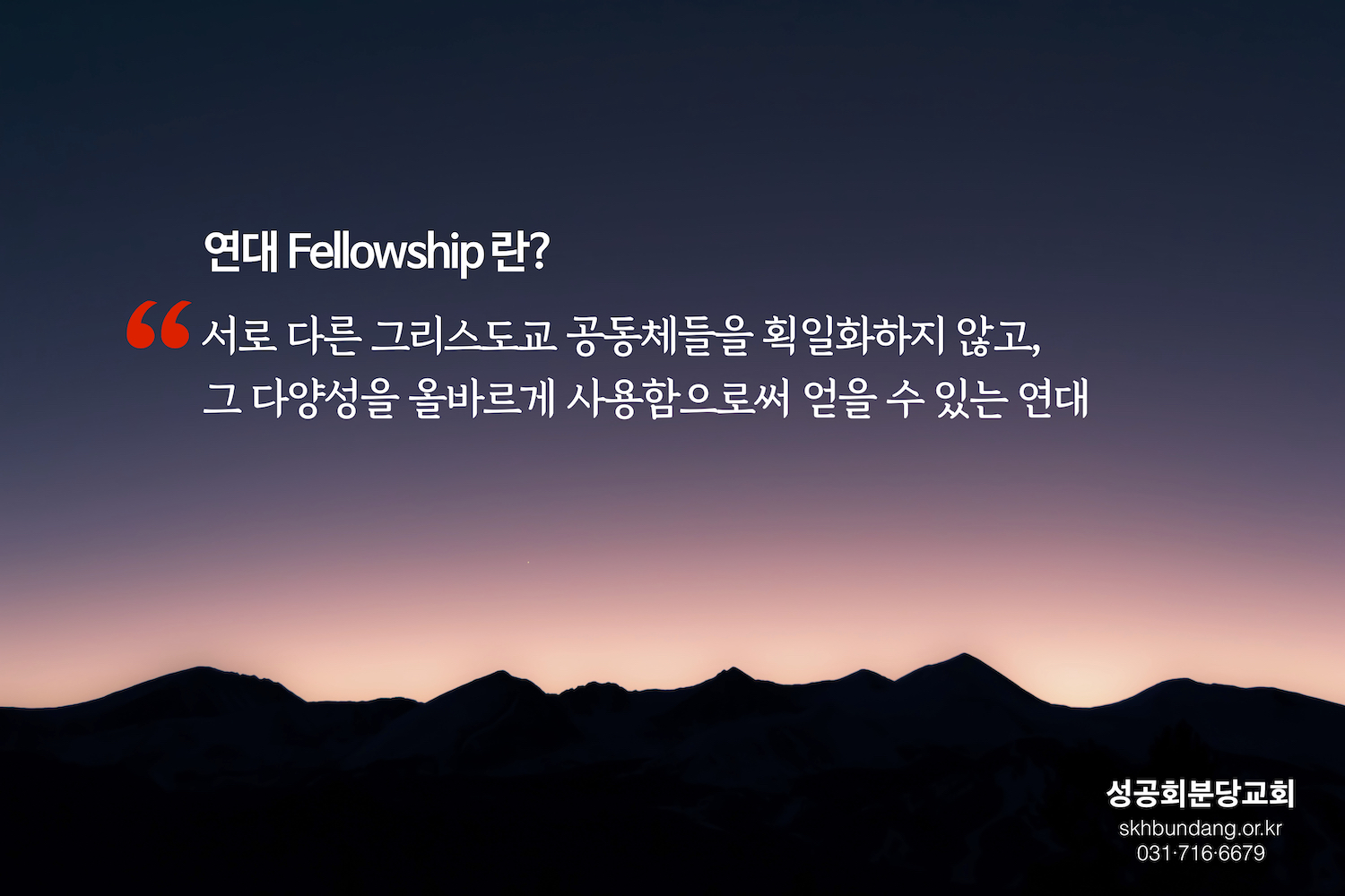 "연대fellowship를 갈망하는 세상에 우리는 우리의 메시지를 전한다. 삶의 비밀은 연대다."
