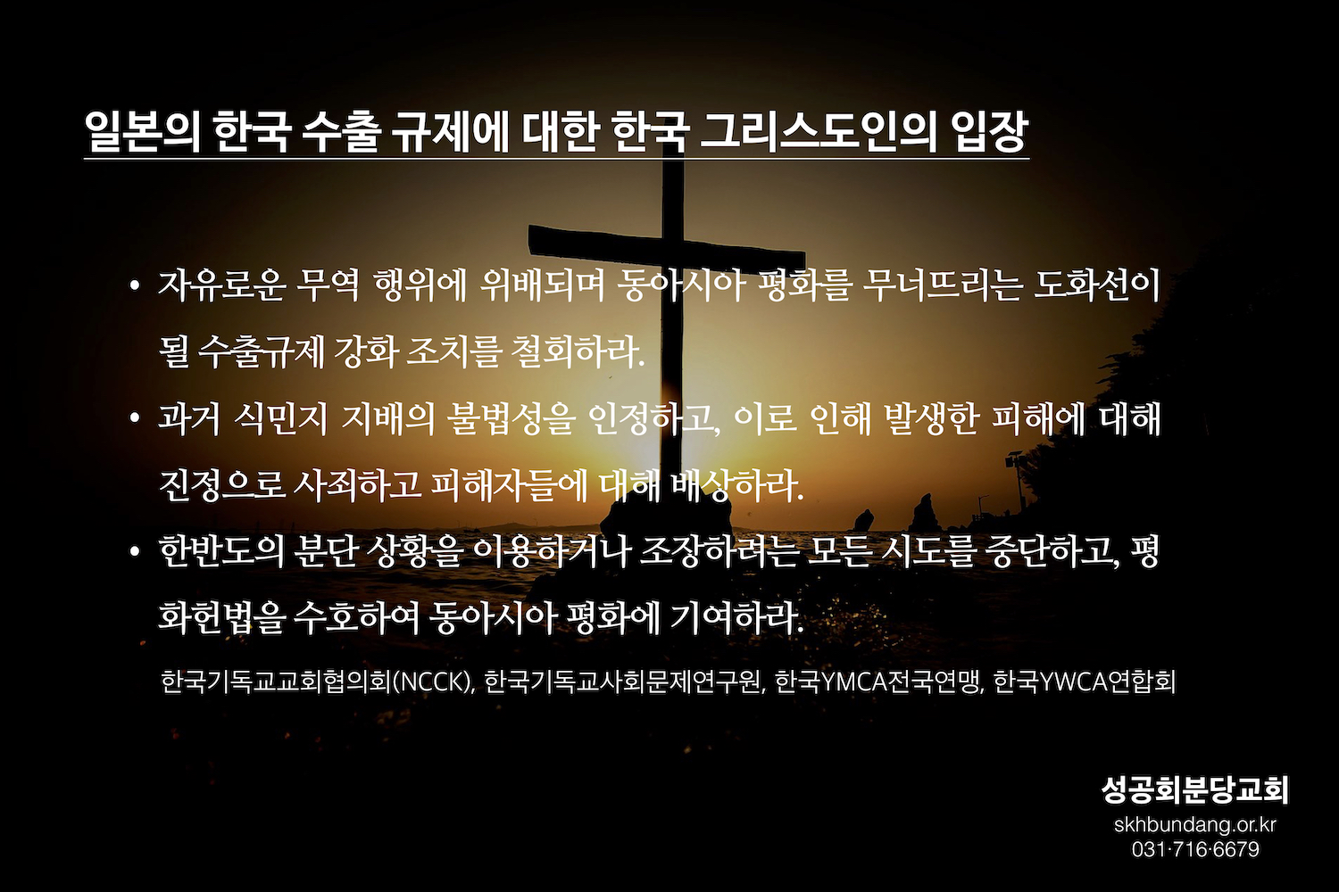 일본 제국주의의 침략으로 인해 굴절된 한반도와 동아시아의 역사 속에서 평화를 만들어가는 일은 역사의 정의를 바로 세우고 이에 대한 사죄와 배상을 실현하려는 일본 정부의 진실한 노력 없이는 불가능하다. 우리는 지난 5일 일본의 변호사 100여 명이 발표한 아베정권의 이번 조치의 부당성에 대한 성명에 전적으로 동의하며 국가주의와 민족주의에 굴복하지 않는 일본 지성인들의 선한 투쟁에 연대와 지지를 보낸다. 평화를 만드는 사람들로 부름을 받은 우리 그리스도인들과 시민들은 국가주의와 민족주의의 한계를 넘어 역사를 올바로 세우고 동북아지역의 화해와 평화, 정의를 세우는 일에 최선을 다할 것을 다짐한다.