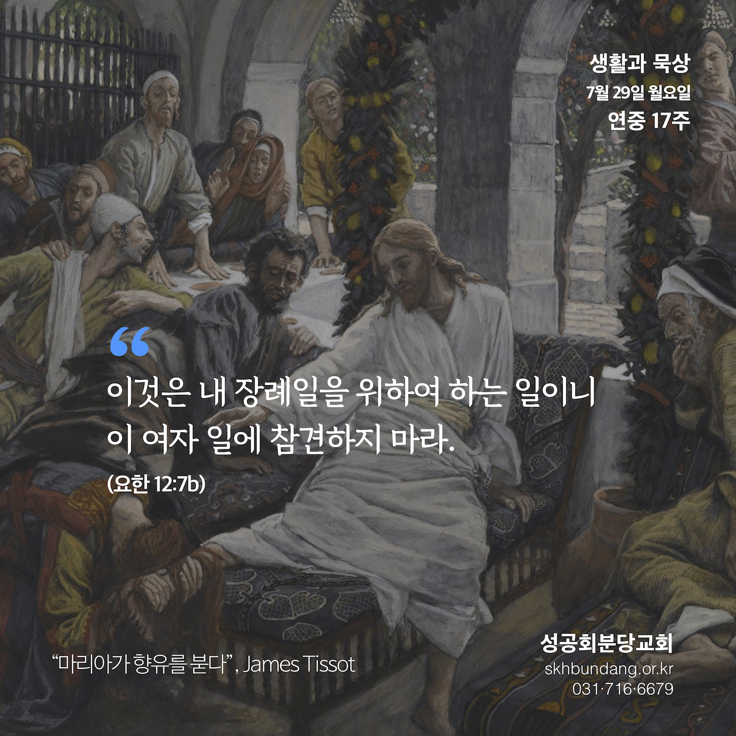 7. 예수께서는 이렇게 말씀하셨다. “이것은 내 장례일을 위하여 하는 일이니 이 여자 일에 참견하지 마라.