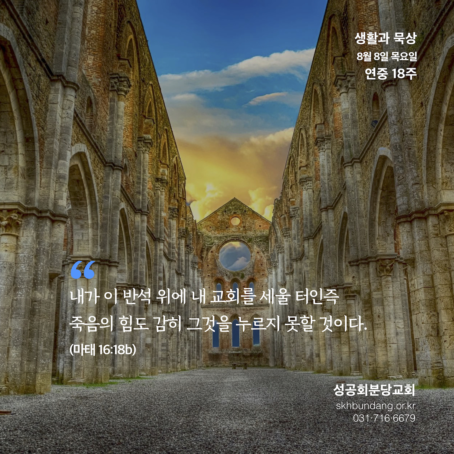 교회는 사람이 세운 것이 아니라 예수 그리스도가 친히 세우셨으니 죽음의 힘도 그것을 누르지 못한다고 하시니까요. 뒤돌아보면 교회는 정말 수많은 역경과 시련 속에서도 견디어내고, 이겨내 왔습니다. 언제나 예수 그리스도께서 보호하시고 지켜주셨기 때문에 가능한 일이겠지요.