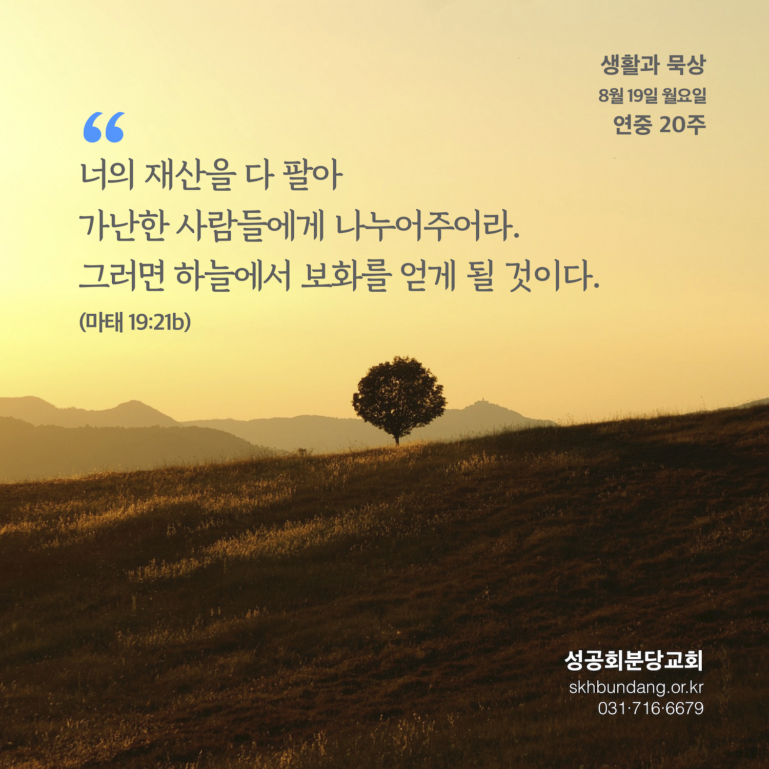 21 예수께서는 “네가 완전한 사람이 되려거든 가서 너의 재산을 다 팔아 가난한 사람들에게 나누어주어라. 그러면 하늘에서 보화를 얻게 될 것이다. 그러니 내가 시키는 대로 하고 나서 나를 따라오너라.” 하셨다.