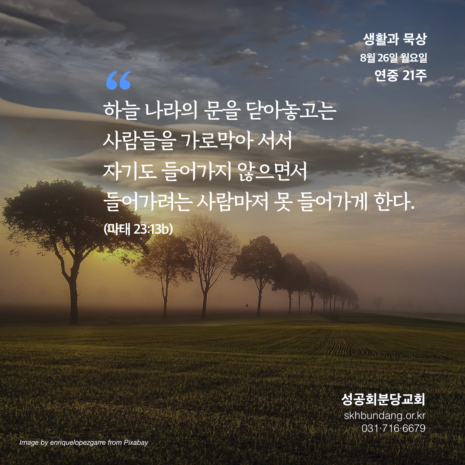사람들은 하늘나라로 이끌지 못하고 가로막는 이는 문 앞에 버티고 선 몸짓 큰 저인 것입니다. 부끄러워 숨고 싶은 생각이 들었습니다. 하늘나라로 가는 길을 가로막지 않기 위해서는 작아져야 하겠습니다. 그렇게 하기 위해서는 저를 드러내는 일을 멀리하고 듣는 귀를 열어주고 겸손한 종이 되어야 함을 알게 됩니다. 하늘나라 가는 길에 걸림돌이 되고 싶지는 않기 때문입니다.
