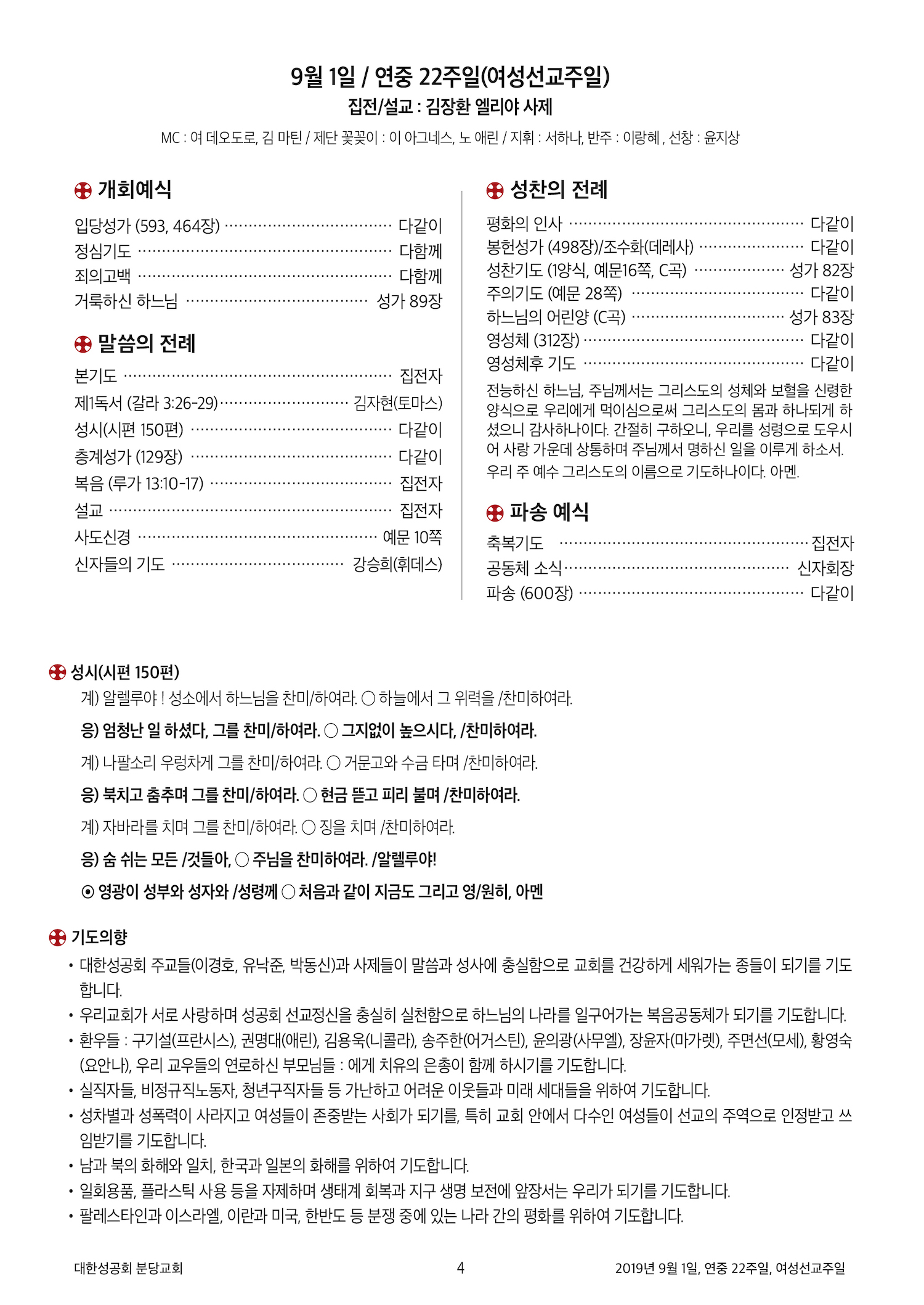 2019년 9월 1일 / 연중 22주일 / 여성선교주일