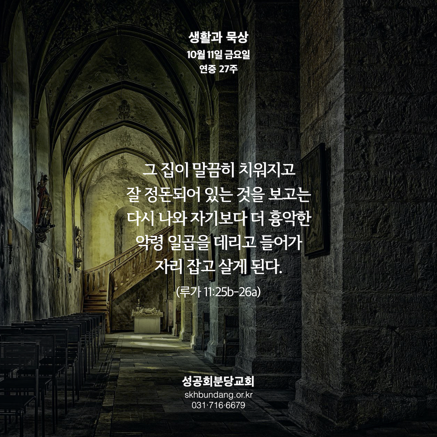 예전엔 잘 이해하지 못했던 오늘의 말씀, 오늘은 이렇게 들여옵니다. 악령이 가득한 이 땅을 정화하기 위해 주님은 2백여 년 전에 복음의 전도사들을 보내주셨습니다. 수난과 역경 속에서도 수많은 복음의 전도자들은 이 땅의 불결함을 치우는 데 헌신하였습니다. 촌구석 말할 것도 없이 정화의 십자가가 방방곡곡에 세워졌습니다. 그런데 말이죠. 어느 순간부터 우리 안에 우쭐함이 자라기 시작했습니다. 오늘의 복음말씀, "그 집이 말끔히 치워지고 잘 정돈되어 있는 것을 보고는 더 흉악한 악령 일곱을 데리고 들어가 자리 잡고 살게 된다."는 말씀처럼 이 땅의 교회 안에 일곱 악령이 더 자리 잡게 되었습니다. 그 악령들이란 우리 안의 우쭐함에서 비롯된 것인데, 그것들은 이렇습니다. "탐식, 음욕, 탐욕, 슬픔, 분노, 영적 태만, 헛된 영광, 교만."