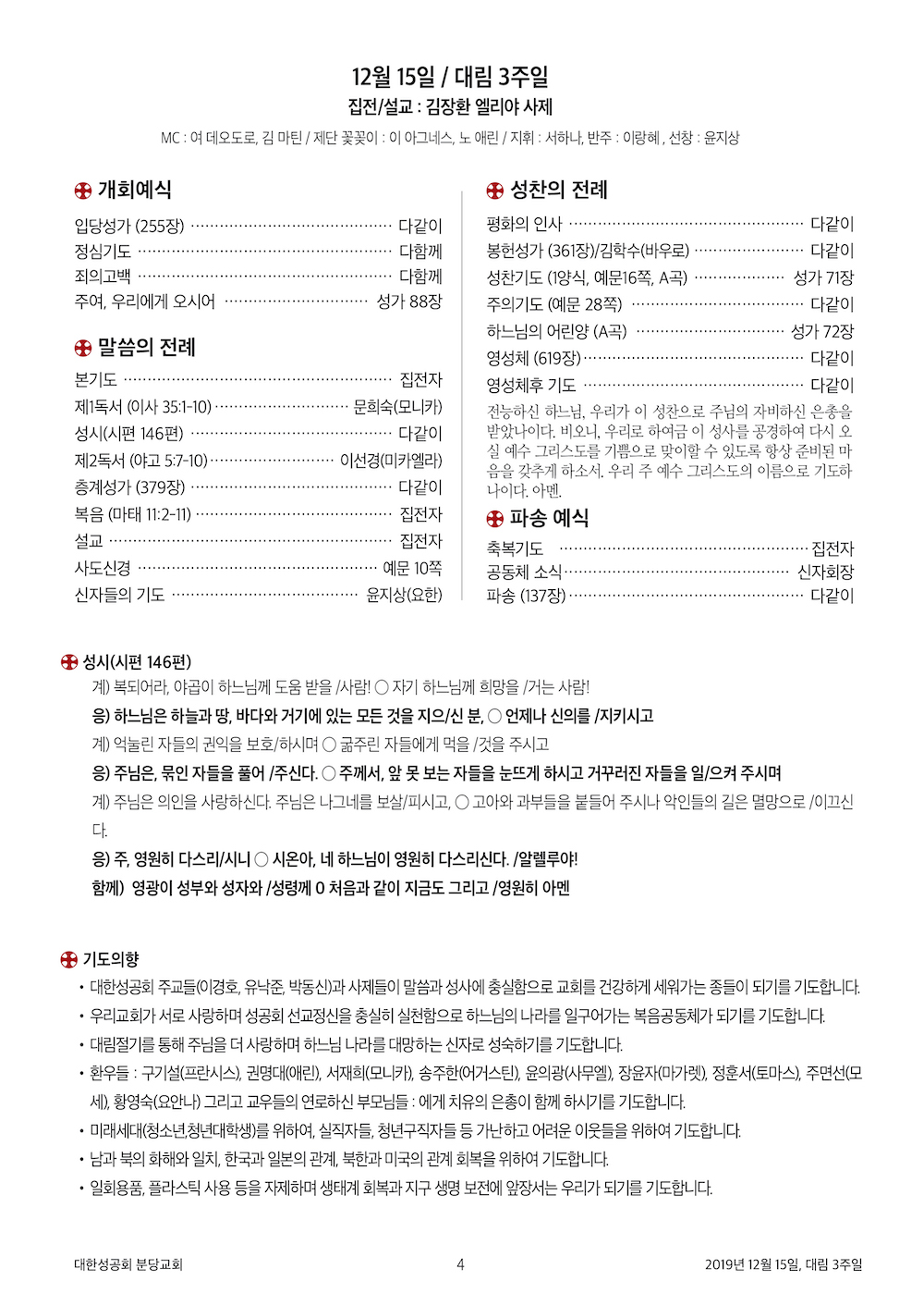 교회 주보 대림 3주일 by 분당교회 2019. 12. 15. 2019년 12월 15일, 대림 3주일성공회 분당교회 주보 공유하기 게시글 관리 대한성공회 분당교회 '교회 주보' 카테고리의 다른 글 성탄절 (0) 2019.12.28 대림 4주일 (0) 2019.12.22 대림 2주일 (0) 2019.12.08 대림 1주일 (0) 2019.12.01 왕이신 그리스도 주일 (0) 2019.11.24 관련글 성탄절 대림 4주일 대림 2주일 대림 1주일 댓글