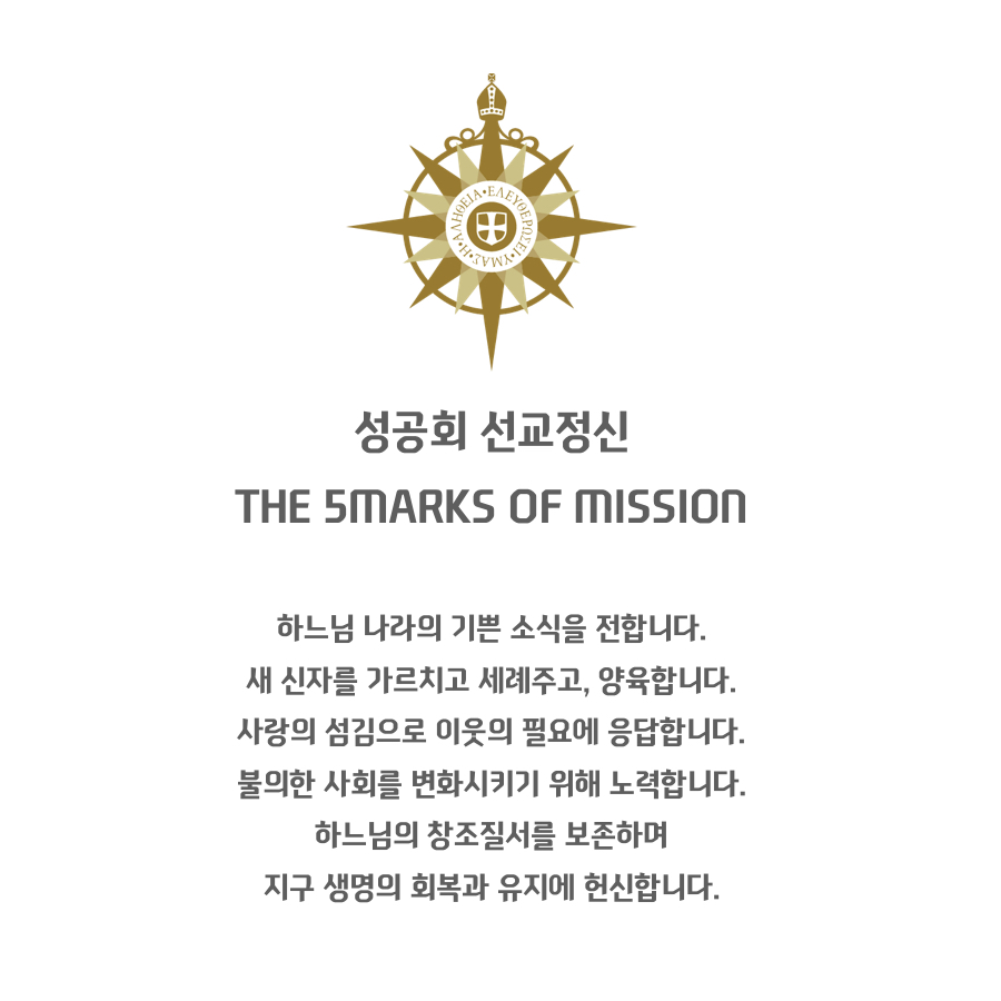 성공회는 이것을 구체적으로 선교정신 5MARKS로 정리하였습니다. 1 하느님 나라의 기쁜 소식을 전하기. 2 새신자를 가르치고, 세례를 주고, 양육하기 .3 사랑의 섬김으로 이웃의 필요에 응답하기. 4 불의한 사회를 변혁하며, 모든 폭력에 도전하고 평화와 화해를 위하여 노력하기. 5 창조질서를 보존하며, 지구 생명의 회복과 유지에 헌신하기.
