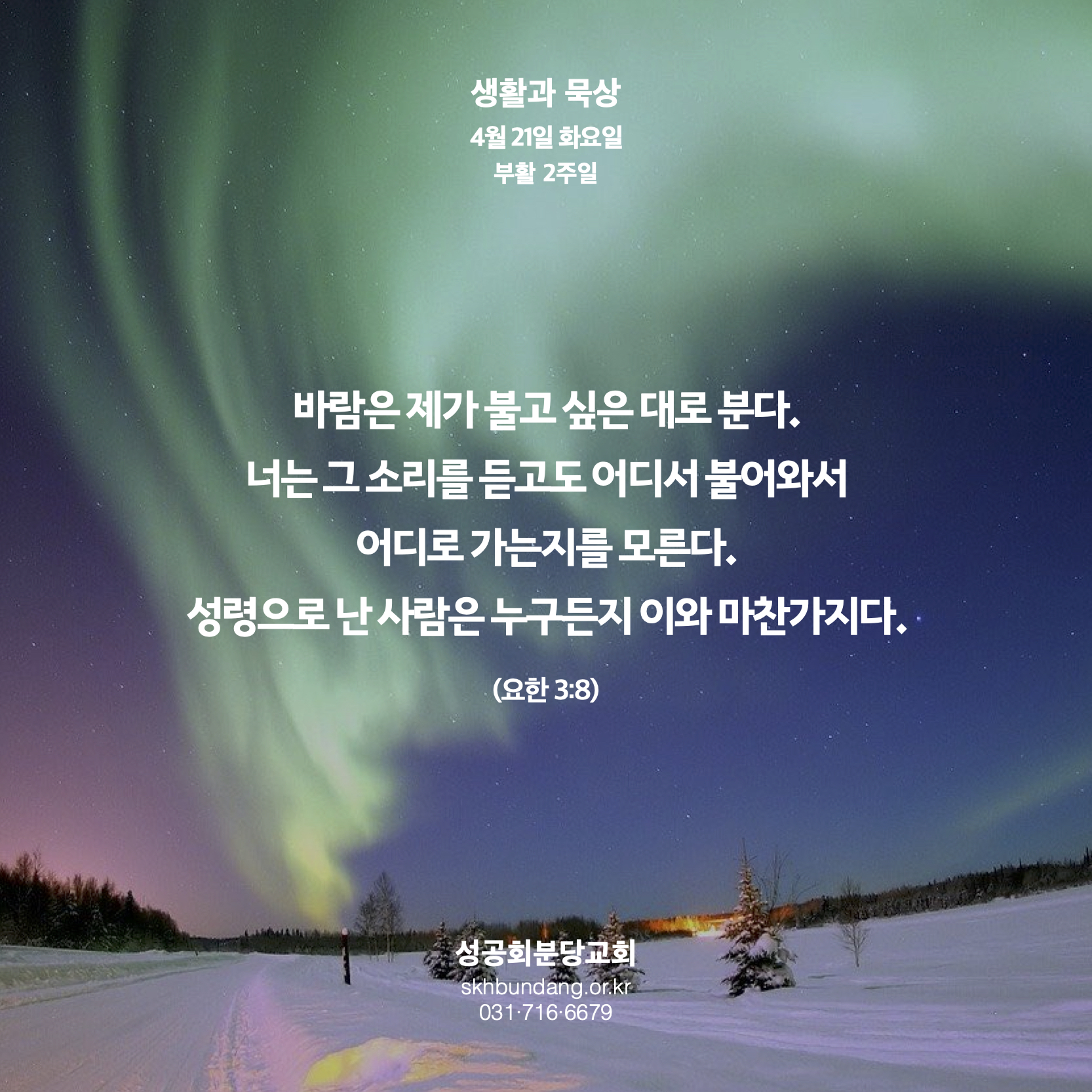 8 바람은 제가 불고 싶은 대로 분다. 너는 그 소리를 듣고도 어디서 불어와서 어디로 가는지를 모른다. 성령으로 난 사람은 누구든지 이와 마찬가지다.” 예수께서 이렇게 대답하시자