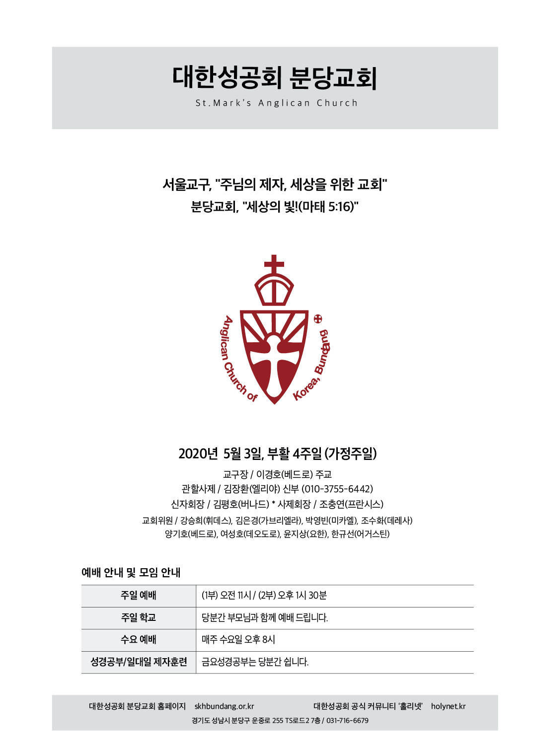 교회 주보 부활 4주일 (가정주일) by 분당교회 2020. 5. 3. 2020년 5월 3일, 부활 4주일 (가정주일) 성공회 분당교회 주보 공유하기 게시글 관리 대한성공회 분당교회 '교회 주보' 카테고리의 다른 글 부활 6주일 (0) 2020.05.17 부활 5주일 (0) 2020.05.12 부활 3주일 (0) 2020.04.26 부활 2주일 (0) 2020.04.19 부활대축일 (0) 2020.04.12 관련글 부활 6주일 부활 5주일 부활 3주일 부활 2주일 댓글