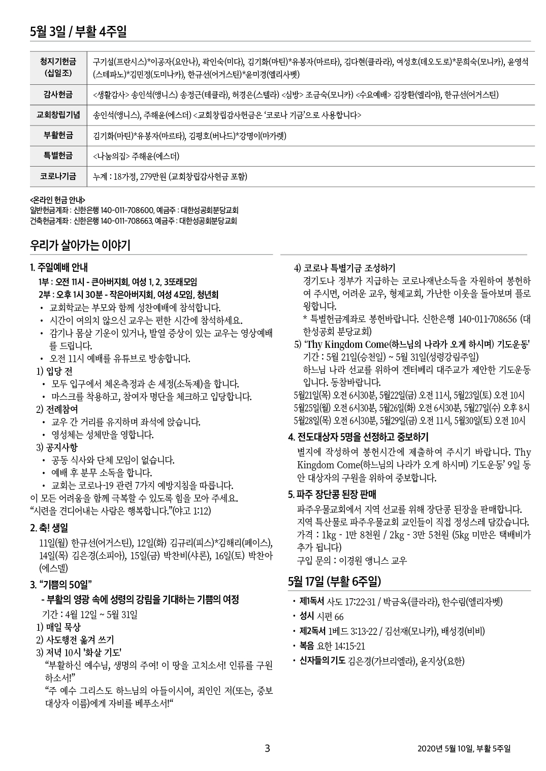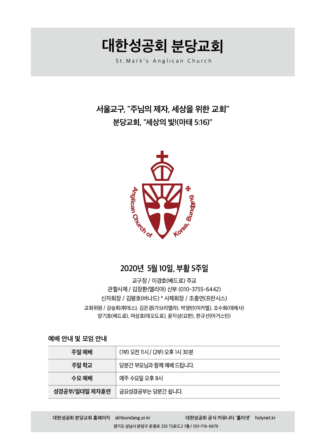 교회 주보 부활 5주일 by 분당교회 2020. 5. 12. 2020년 5월 10일, 부활 5주일 성공회 분당교회 주보 공유하기 게시글 관리 대한성공회 분당교회 '교회 주보' 카테고리의 다른 글 예수승천대축일 (0) 2020.05.24 부활 6주일 (0) 2020.05.17 부활 4주일 (가정주일) (0) 2020.05.03 부활 3주일 (0) 2020.04.26 부활 2주일 (0) 2020.04.19 관련글 예수승천대축일 부활 6주일 부활 4주일 (가정주일) 부활 3주일 댓글
