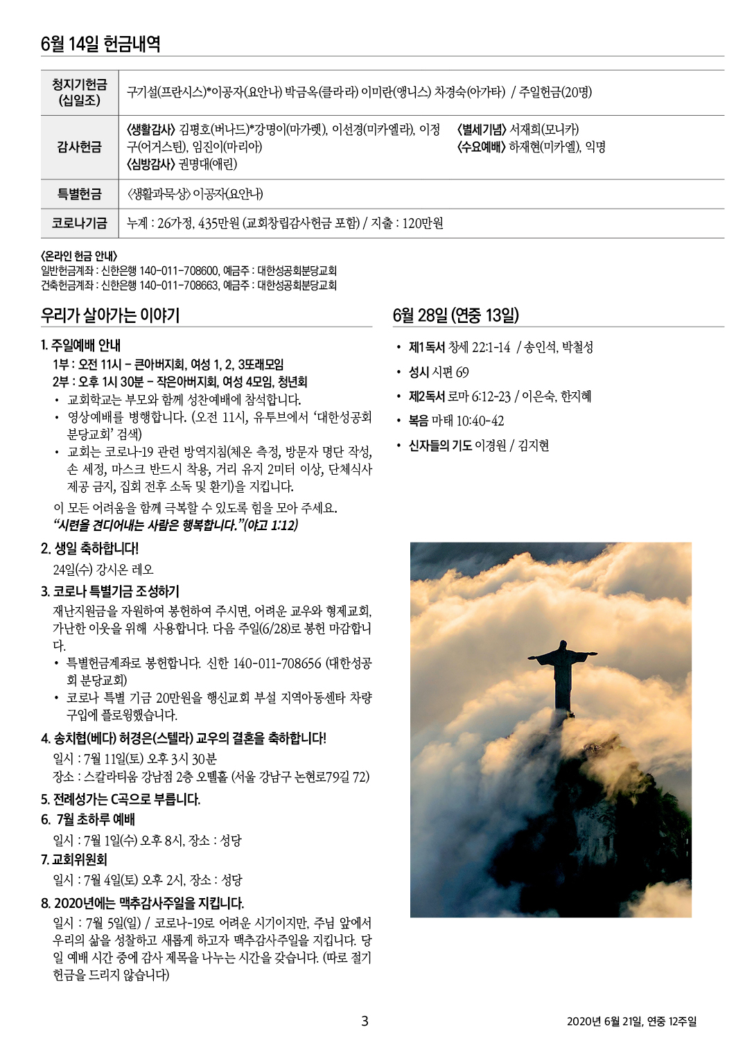 교회 주보 연중 12주일 by 분당교회 2020. 6. 21. 2020년 6월 21일, 연중 12주일 성공회 분당교회 주보 공유하기 게시글 관리 대한성공회 분당교회 '교회 주보' 카테고리의 다른 글 맥추감사주일 (0) 2020.07.05 연중 13주일 (0) 2020.06.28 연중 11주일 (0) 2020.06.14 성삼위일체주일 (0) 2020.06.07 성령강림주일 (0) 2020.05.31 관련글 맥추감사주일 연중 13주일 연중 11주일 성삼위일체주일 댓글