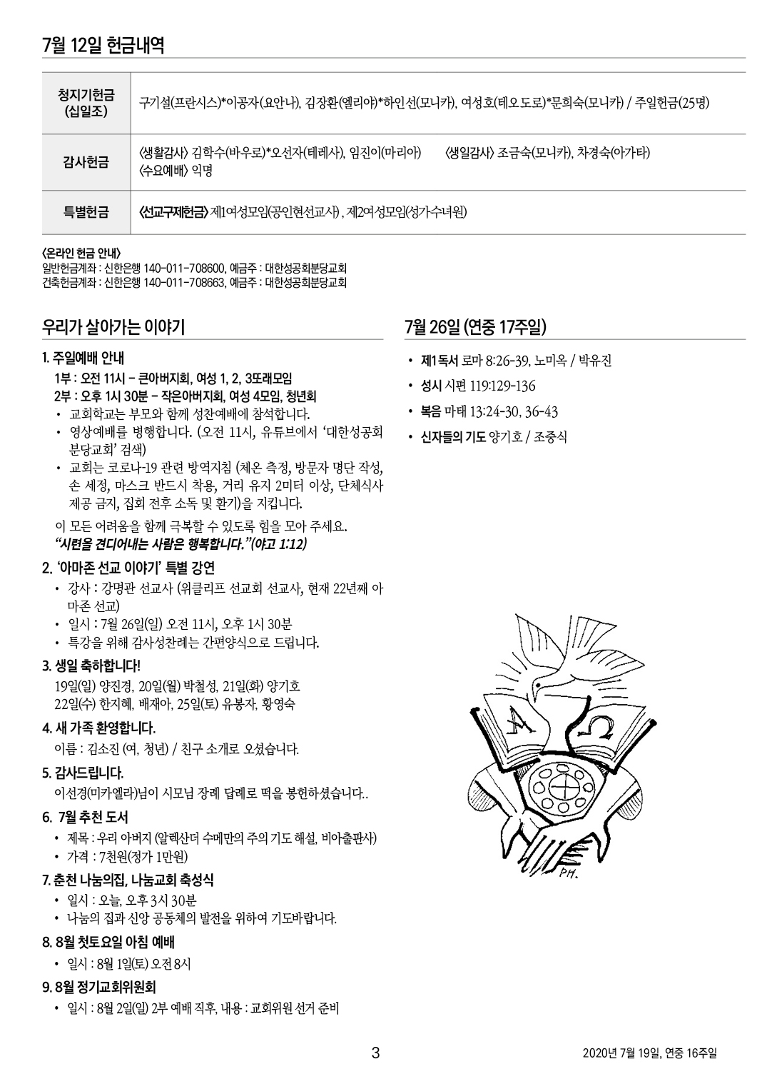 교회 주보 연중 16주일 by 푸드라이터 2020. 7. 19. 2020년 7월 19일, 연중 16주일성공회 분당교회 주보 공유하기 게시글 관리 대한성공회 분당교회 '교회 주보' 카테고리의 다른 글 연중 18주일 (0) 2020.08.02 연중 17주일 (0) 2020.07.26 연중 15주일 (0) 2020.07.12 맥추감사주일 (0) 2020.07.05 연중 13주일 (0) 2020.06.28 관련글 연중 18주일 연중 17주일 연중 15주일 맥추감사주일 댓글