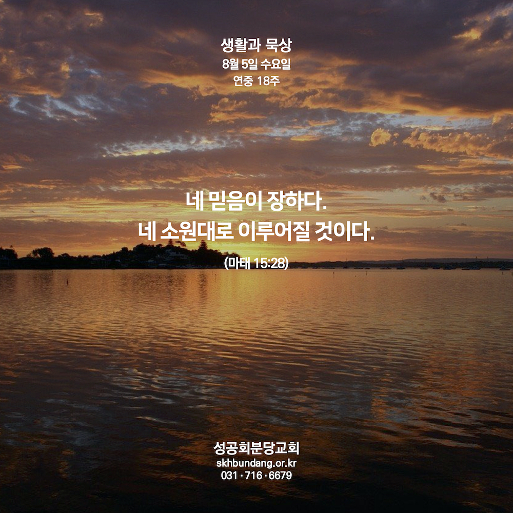 28 그제야 예수께서는 "여인아! 참으로 네 믿음이 장하다. 네 소원대로 이루어질 것이다." 하고 말씀하셨다. 바로 그 순간에 여자의 딸이 나았다.