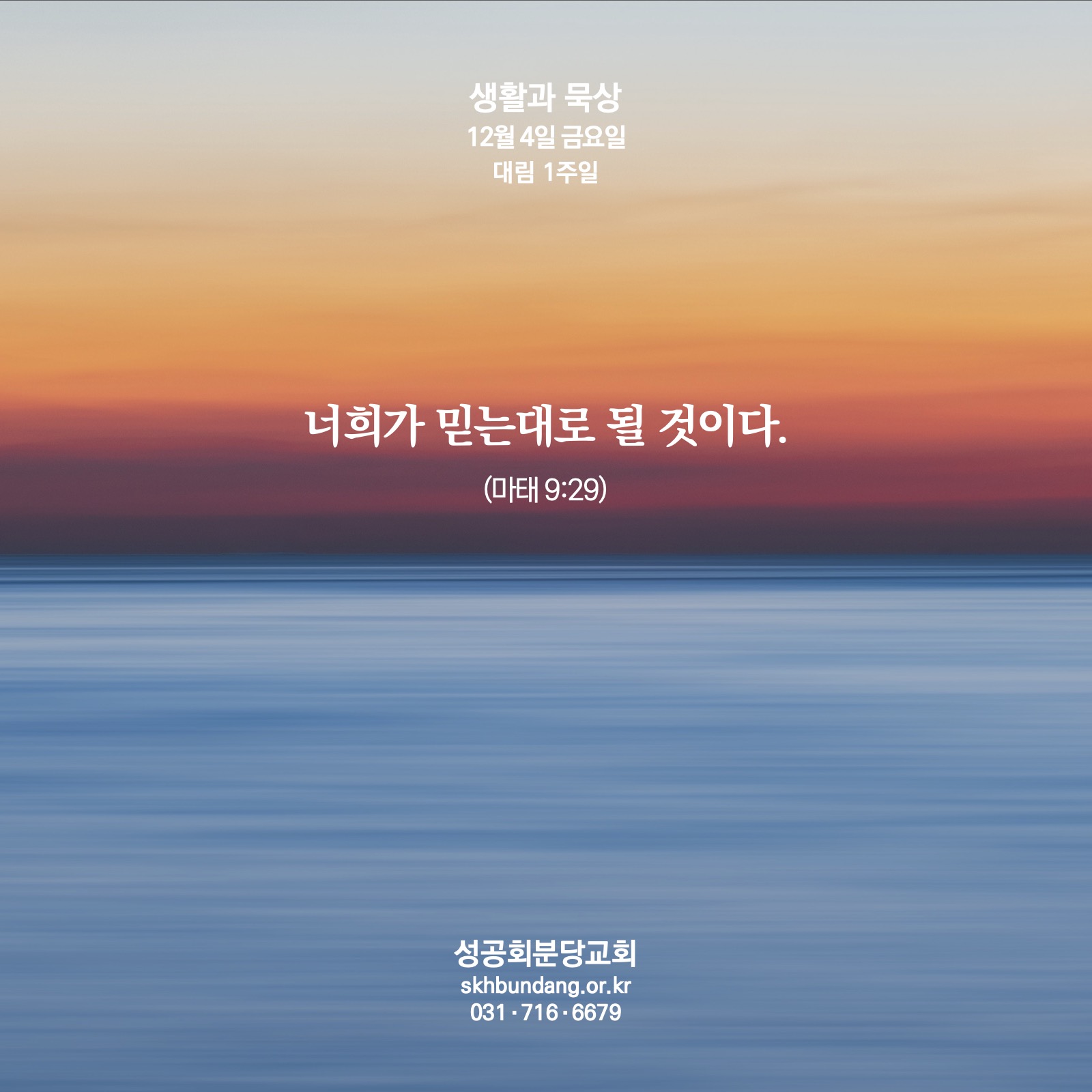 29 예수께서는 그들의 눈을 만지시며 “너희가 믿는대로 될 것이다.” 하고 말씀하셨다.