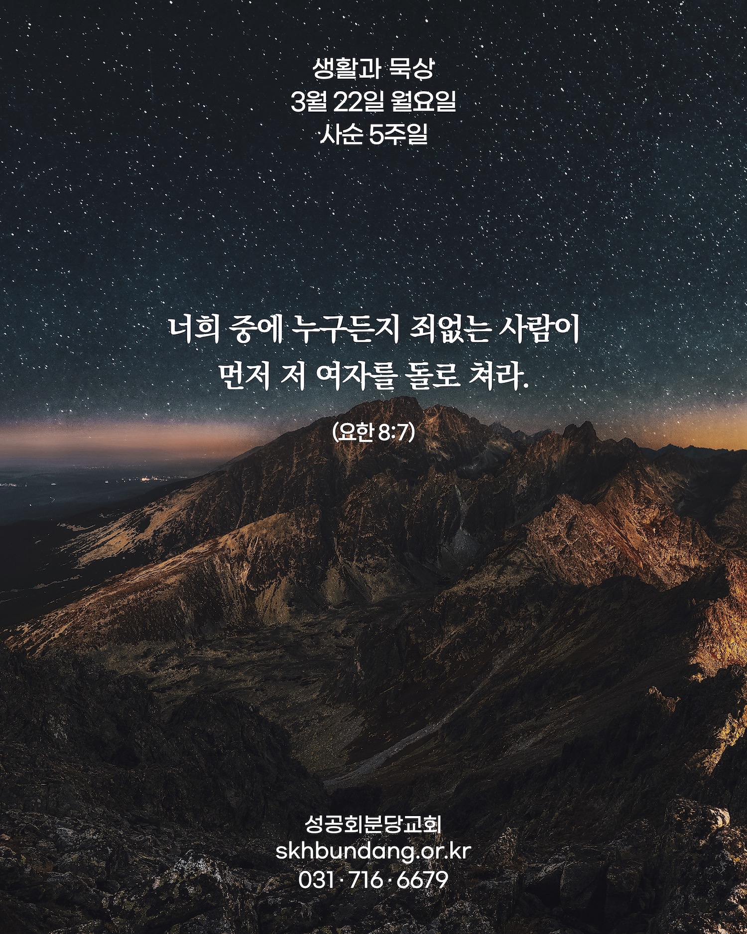 간음한 여인을 심판하고 돌로 죽이자며 소리치고 선동하는 동안 몇몇 남자들은 영웅심에 도취되어 있었을지도 모르겠습니다. 하지만 그런 행위들이 과연 누구의 삶을 바꿀 수 있을까요. 자기만족감 외에 어떤 유익이 있을까요. 차라리 우리는 우리 마음속 양심의 소리를 듣는 편이 더 나을지도 모릅니다. 양심은 우리 마음속에 언제나 살아있어서, '너희 중에 죄없는 사람'이라는 예수님의 부름을 듣는 순간 머리 한쪽에 밀어뒀던 '진정 정의로운 삶'에 대한 부채감을 되살립니다. 세상이 이미 죄인이라 규정한 사람을 향해서만 욕을 보태고 돌을 던지자며 화를 내는 수준의 '안전한 정의감' 정도로는 그 양심의 가책을 피할 수 없습니다. 내가 죄인이라는 사실을 외면하기 위해 '공공의 적'을 심판하는 데 동참하는 것만으로는 구원의 기쁨에 이를 수 없는 것입니다. 양심을 통해 말씀하시는 하느님의 목소리를 따라, 작은 행위로나마 사랑을 실천하는 순간에야 우리는 비로소 그 기쁨을 맛볼 수 있을 것입니다.