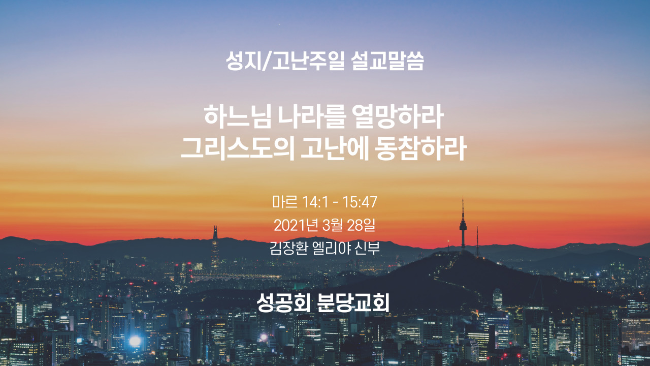 ‘고난’으로 번역되는 Passion의 다른 뜻은 ‘열정’입니다. 예수님이 고난을 겪으신 이유는 하느님 나라를 향한 열정 때문이었습니다. 하느님의 나라는 사랑으로 공평과 정의를 행하여 샬롬이 넘치는 나라입니다.