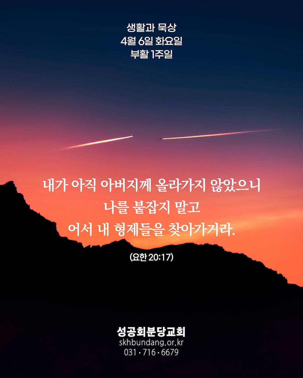 묵상카드 나를 붙잡지 말고 by 분당교회 2021. 4. 6. 2021년 4월 6일(화) 요한 20:11-18 <묵상기도> 걱정과 불안을 친구들과 나누고, 막힌 눈과 귀를 열게 도와주세요. 공유하기 게시글 관리 대한성공회 분당교회 '묵상카드' 카테고리의 다른 글 마음을 열어 (0) 2021.04.08 희망의 하느님, 하느님의 희망 (0) 2021.04.07 평안하냐 (0) 2021.04.06 부활 축하 (0) 2021.04.04 어둔 밤 (0) 2021.04.03 관련글 마음을 열어 희망의 하느님, 하느님의 희망 평안하냐 부활 축하 댓글