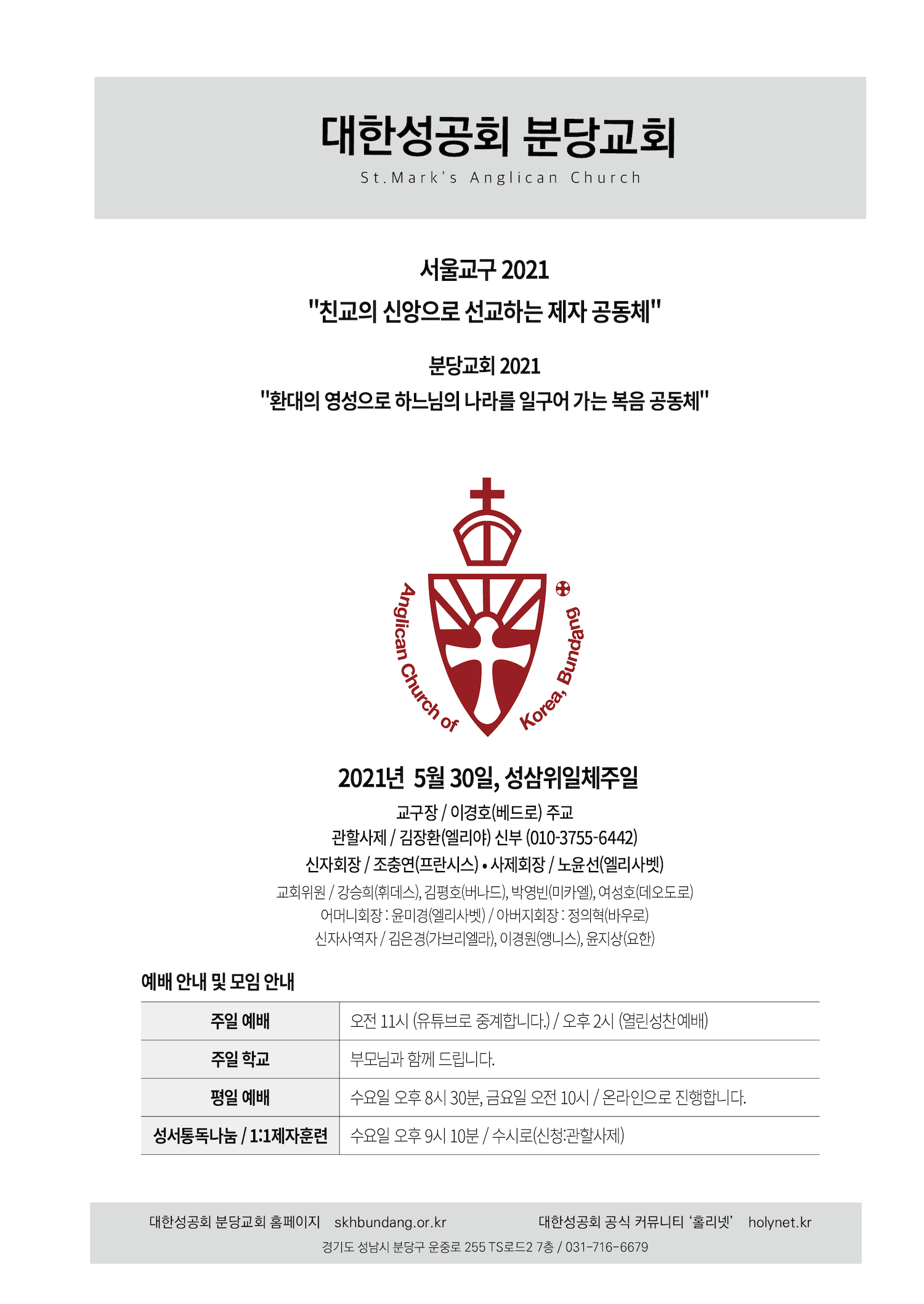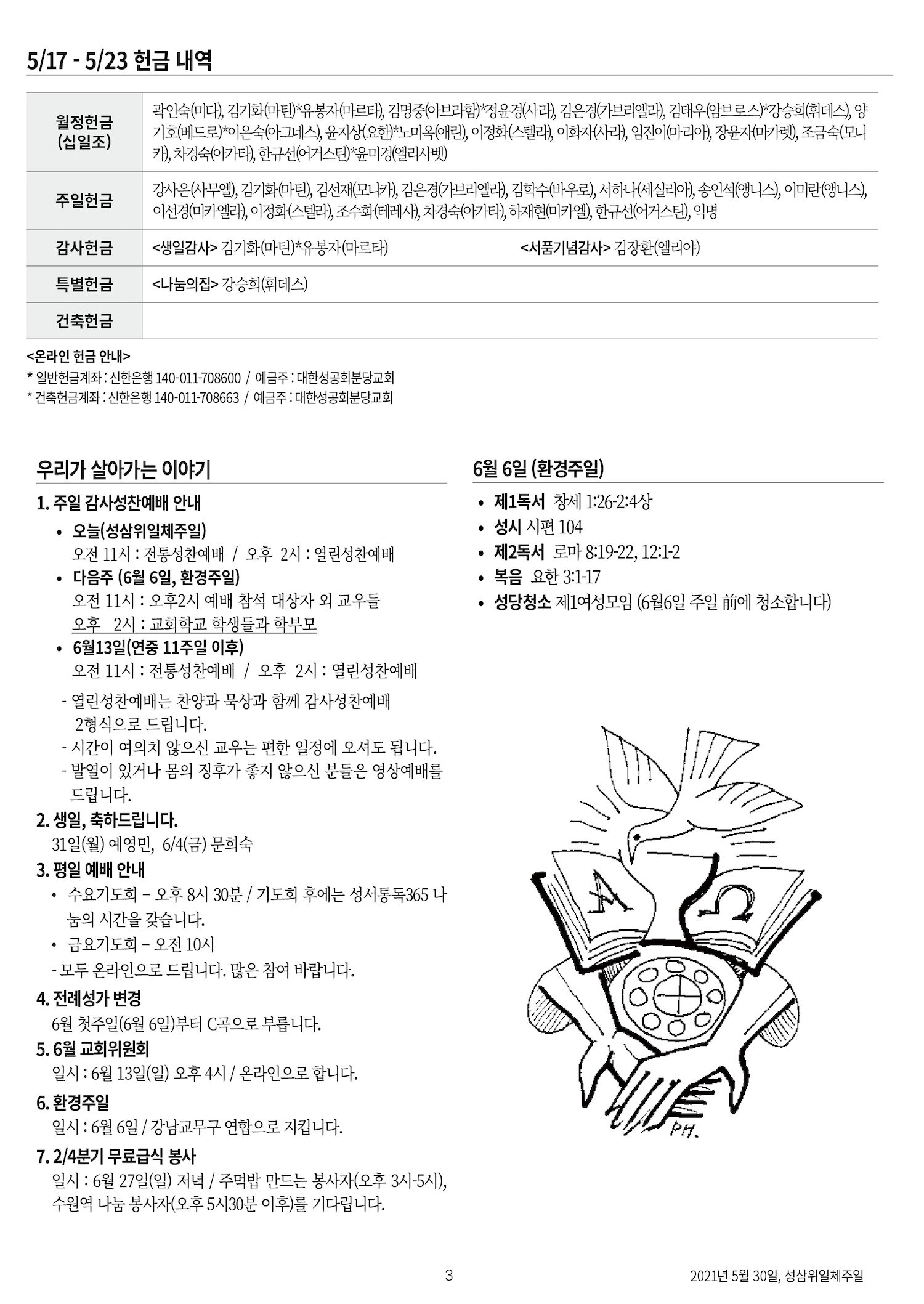 교회 주보 성삼위일체주일 by 분당교회 2021. 5. 30. 공유하기 게시글 관리 대한성공회 분당교회 '교회 주보' 카테고리의 다른 글 연중 11주일 (0) 2021.06.13 환경주일 (0) 2021.06.06 성령강림주일 (0) 2021.05.23 예수승천대축일 (0) 2021.05.16 가정주일 (0) 2021.05.09 관련글 연중 11주일 환경주일 성령강림주일 예수승천대축일 댓글