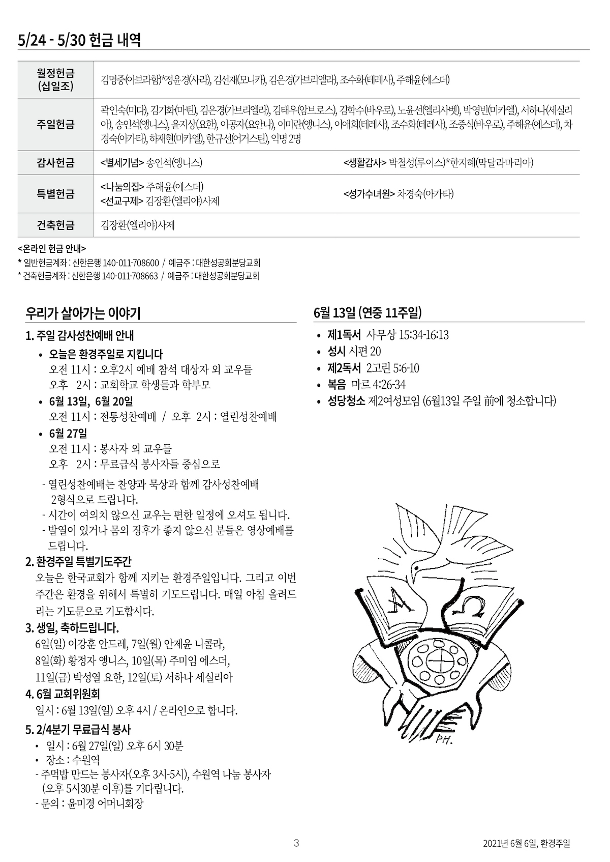 교회 주보 환경주일 by 분당교회 2021. 6. 6. 2021년 6월 6일 환경주일 공유하기 게시글 관리 대한성공회 분당교회 '교회 주보' 카테고리의 다른 글 연중 12주일 (0) 2021.06.20 연중 11주일 (0) 2021.06.13 성삼위일체주일 (0) 2021.05.30 성령강림주일 (0) 2021.05.23 예수승천대축일 (0) 2021.05.16 관련글 연중 12주일 연중 11주일 성삼위일체주일 성령강림주일 댓글