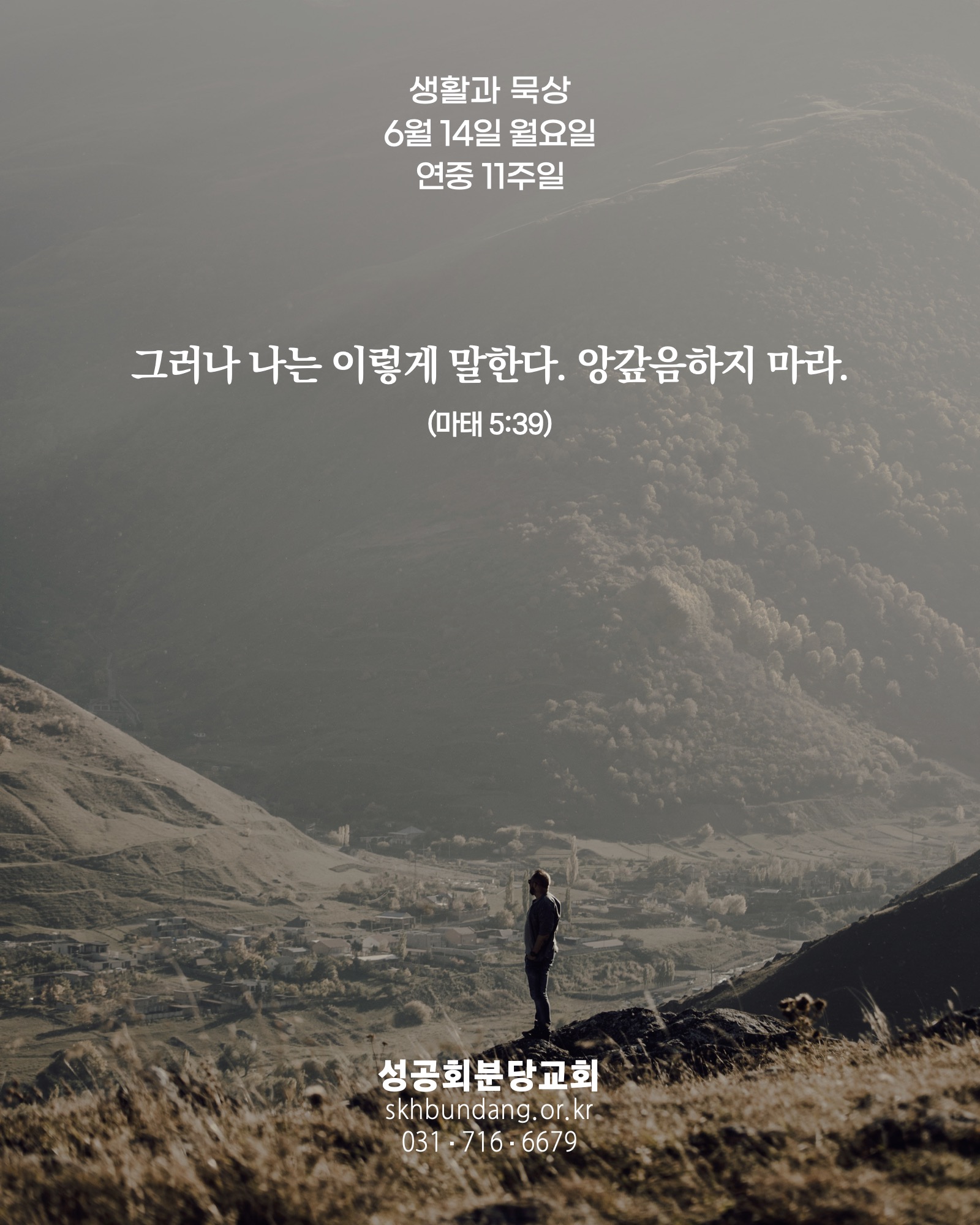 묵상카드 앙갚음하지 마라 by 분당교회 2021. 6. 14. 2021년 6월 14일 (월) 마태 5:38-42 <묵상기도> 우리가 서로에게 가혹해지지 않기를 좀 더 따뜻하기를 기도합니다. 공유하기 게시글 관리 대한성공회 분당교회 '묵상카드' 카테고리의 다른 글 전문직과 봉사직 (0) 2021.06.16 진짜 원수는 누구 (0) 2021.06.15 위로 (0) 2021.06.13 가볍고 연약한 존재 (0) 2021.06.12 나를 벗어난 사랑 (0) 2021.06.11 관련글 전문직과 봉사직 진짜 원수는 누구 위로 가볍고 연약한 존재 댓글