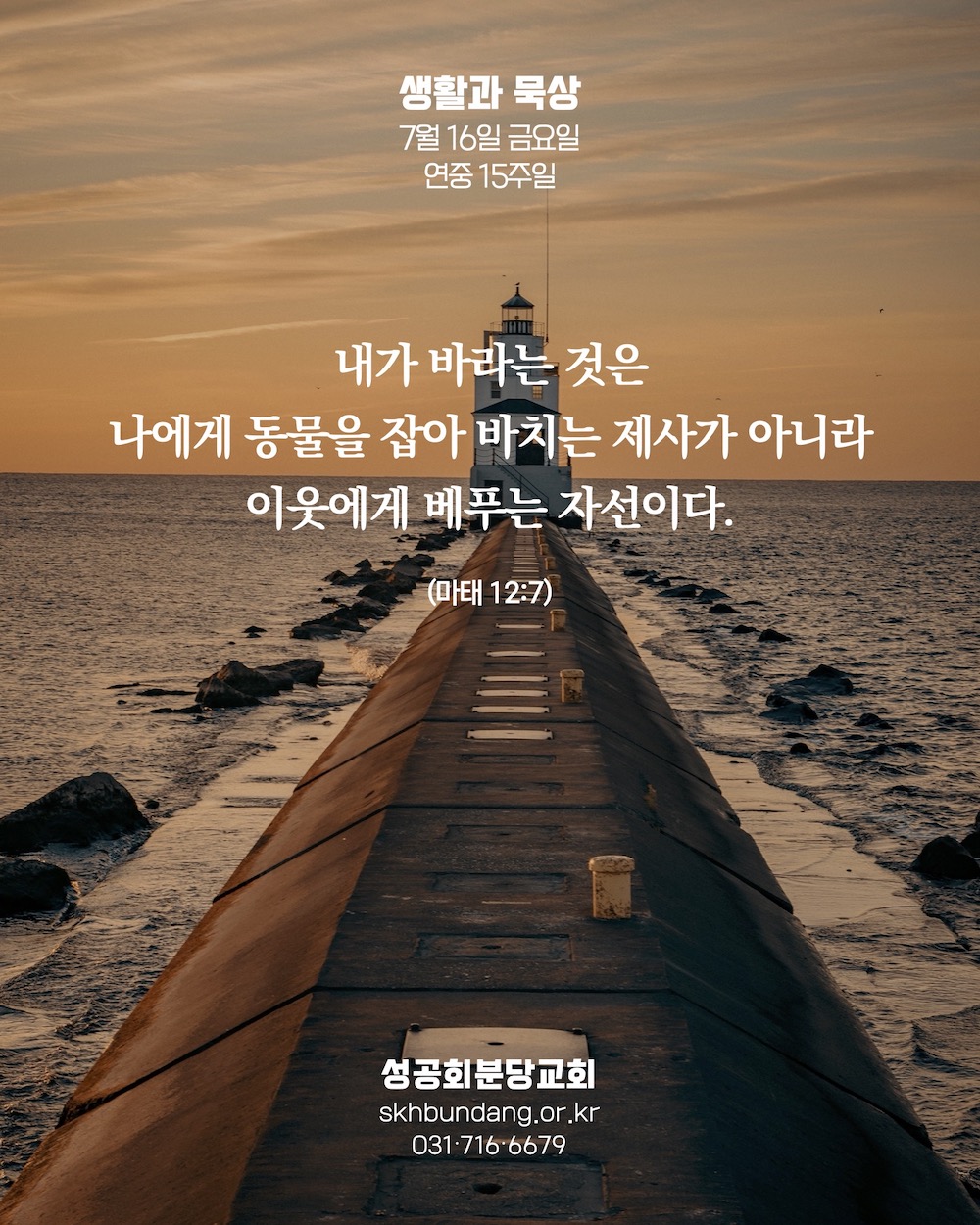 묵상카드 제단에 차려놓은 빵 by 분당교회 2021. 7. 16. 2021년 7월 16일 금요일 마태 12:1-8 <묵상기도> 주님, 가난한 현장에 세워진 주님의 식탁에 빵이 떨어지지 않게 돌보소서. 공유하기 게시글 관리 대한성공회 분당교회 '묵상카드' 카테고리의 다른 글 간절함 (0) 2021.07.18 우린 서로 이방인들 (0) 2021.07.17 나를 지켜주는 짐 (0) 2021.07.15 맑은 눈동자 (0) 2021.07.14 회개 (0) 2021.07.13 관련글 간절함 우린 서로 이방인들 나를 지켜주는 짐 맑은 눈동자 댓글