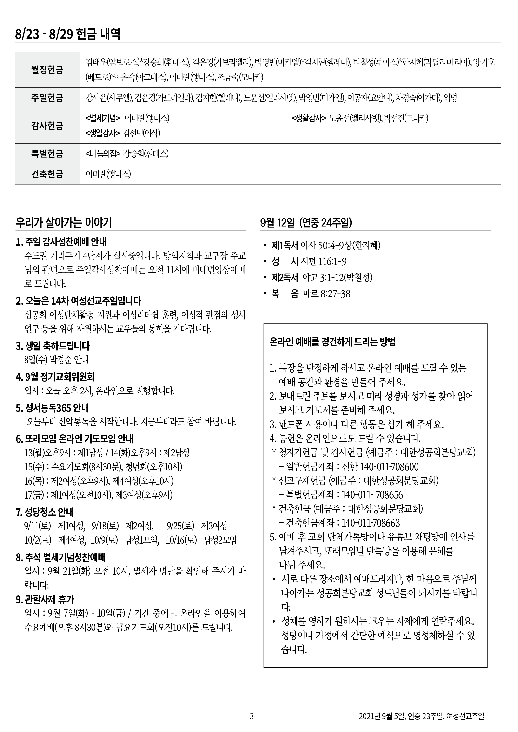 교회 주보 연중 23주일, 여성선교주일 by 분당교회 2021. 9. 5. 2021년 9월 5일 연중 23주일 / 여성선교주일 공유하기 게시글 관리 대한성공회 분당교회 '교회 주보' 카테고리의 다른 글 연중 25주일 (0) 2021.09.19 연중 24주일 (0) 2021.09.12 연중 22주일 (0) 2021.08.30 연중 21주일 (0) 2021.08.23 평화통일주일 (0) 2021.08.15 관련글 연중 25주일 연중 24주일 연중 22주일 연중 21주일 댓글