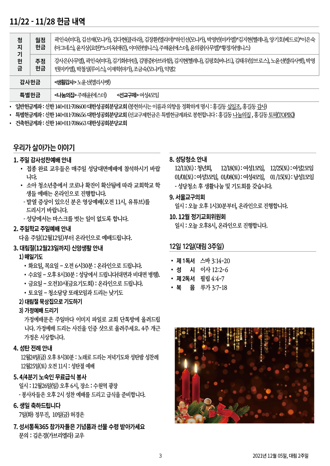 교회 주보 대림 2주일 by 분당교회 2021. 12. 7. 2021년 12월 5일 대림 2주일 공유하기 게시글 관리 대한성공회 분당교회 '교회 주보' 카테고리의 다른 글 성탄 1주일 (0) 2021.12.26 대림 3주일 (0) 2021.12.18 대림 1주일 (0) 2021.11.28 왕이신 그리스도 주일 (0) 2021.11.22 연중 33주일 (0) 2021.11.14 관련글 성탄 1주일 대림 3주일 대림 1주일 왕이신 그리스도 주일 댓글