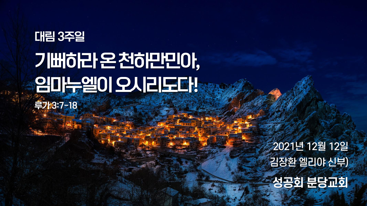 이렇게 “회개했다는 증거를 행실로 보여라”는 요한의 선포 앞에 “일상 가운데 나누고 섬기는 환대의 삶”으로 응답하며, 다시 오실 주님을 기다리는 여러분 모두가 되기를 주님의 이름으로 축복합니다.