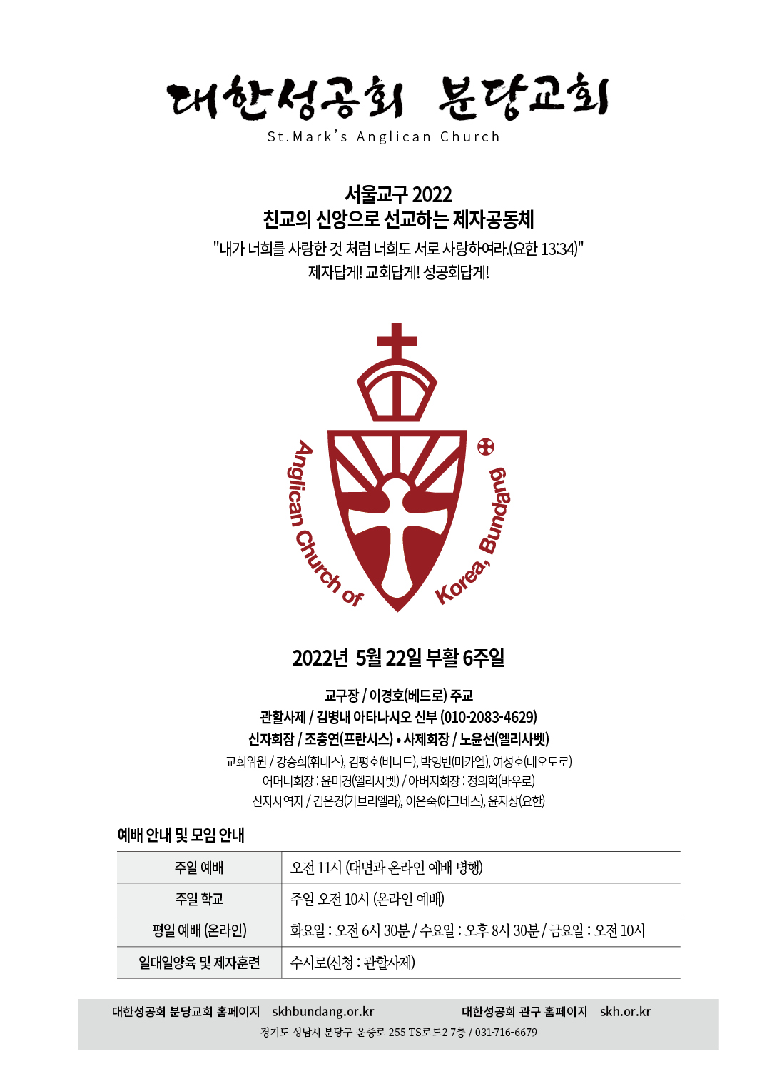 교회 주보 부활 6주일 by 분당교회 2022. 5. 22. 2022년 5월 22일 부활 6주일 성공회 분당교회 주보 공유하기 게시글 관리 대한성공회 분당교회 '교회 주보' 카테고리의 다른 글 성령강림주일 (0) 2022.06.05 승천대축일 (0) 2022.05.29 부활 5주일 (0) 2022.05.15 부활 4주일 (0) 2022.05.08 부활 3주일 (0) 2022.05.02 관련글 성령강림주일 승천대축일 부활 5주일 부활 4주일 댓글