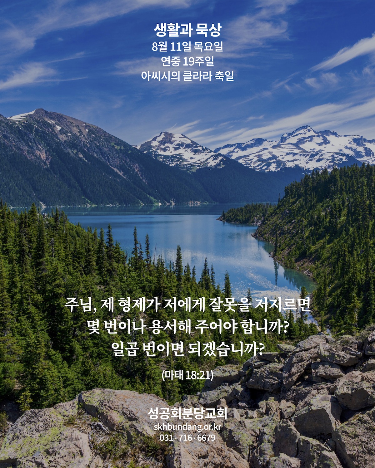 묵상카드 나를 위한 선택, 용서 by 분당교회 2022. 8. 11. 2022년 8월 11일 (목) 마태 18:21-19:1 연중 19주 아씨시의 클라라 축일 <묵상기도> 우리의 삶이 모든 이들의 수고(빚)로 이루어져 있음을 기억하는 오늘이 되게 하소서. 공유하기 게시글 관리 대한성공회 분당교회 '묵상카드' 카테고리의 다른 글 교회에 어린이들이 보이지 않아요 (0) 2022.08.13 미워할 구실 (0) 2022.08.12 마음의 묶임 (0) 2022.08.10 사인여천 (0) 2022.08.09 더 큰 폭으로 (0) 2022.08.08 관련글 교회에 어린이들이 보이지 않아요 미워할 구실 마음의 묶임 사인여천 댓글