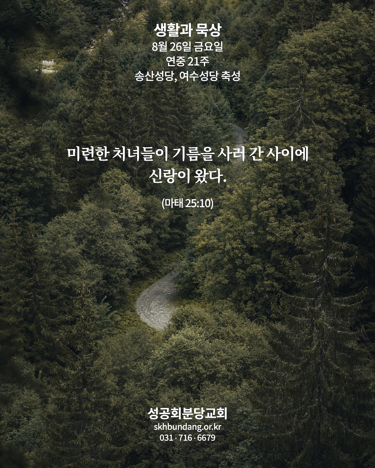 묵상카드 어떻게 되겠지... 하는 적당주의 by 분당교회 2022. 8. 26. 2022년 8월 26일 금요일 마태 25:1-13 연중 21주 송산성당, 여수성당 축성 <묵상기도> 주님, 제가 미루지 않고, "지금, 당장" 일어나서 움직이게 하여주십시오. 공유하기 게시글 관리 대한성공회 분당교회 '묵상카드' 카테고리의 다른 글 하늘나라의 역설 (0) 2022.08.28 사랑 (0) 2022.08.27 행복과 기다림 (0) 2022.08.25 권력 관계 (0) 2022.08.24 사랑이 담긴 잔 (0) 2022.08.23 관련글 하늘나라의 역설 사랑 행복과 기다림 권력 관계 댓글