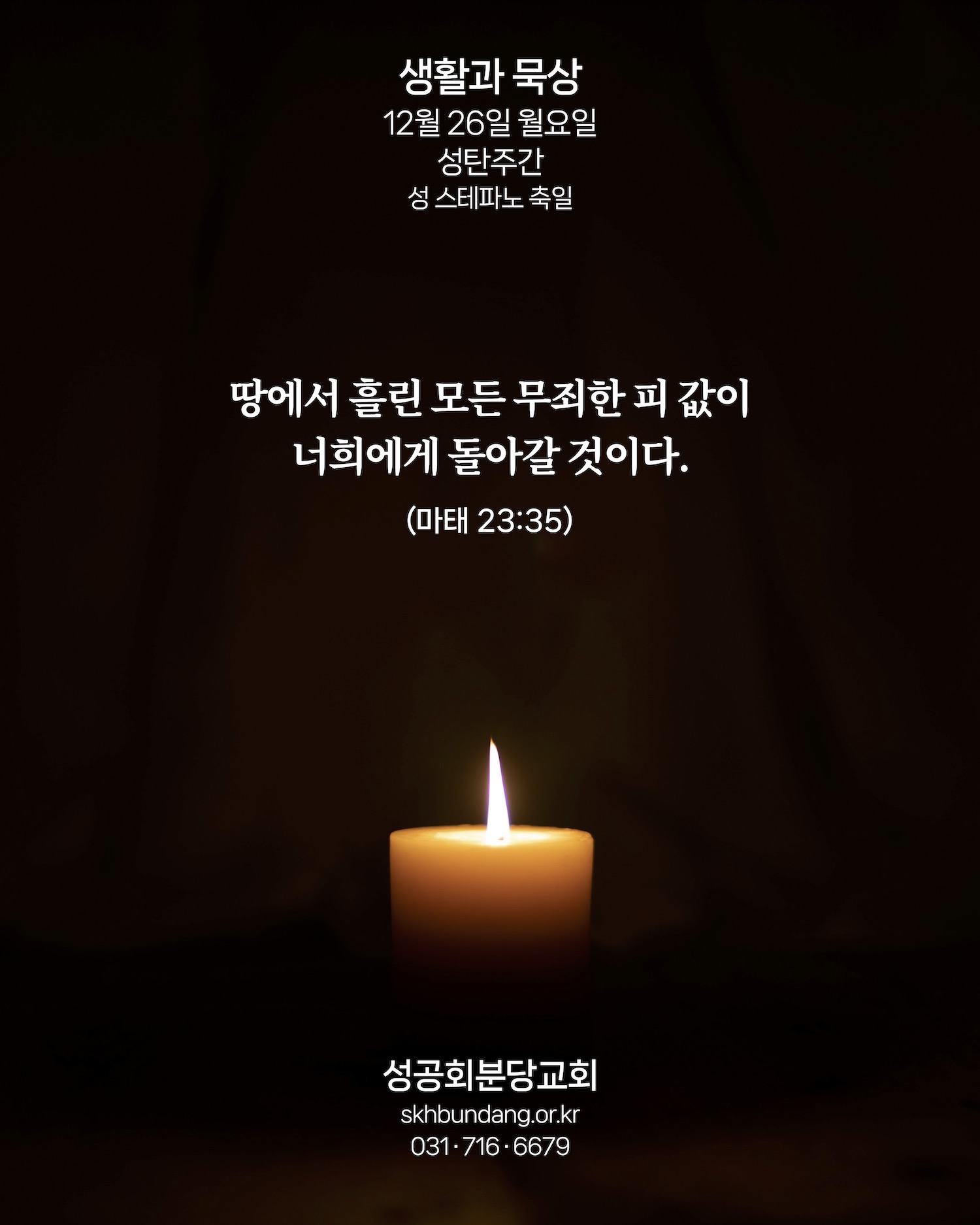 묵상카드 모든 무죄한 피 흘리는 이들에 대한 외면 by 푸드라이터 2022. 12. 26. 2022년 12월 26일 월요일 마태 23:34-39 성 스테파노 축일 <묵상기도> 주님 오늘도 억울하게 고난 당하는 사람들과 무죄하게 죽어가는 사람들이 있다는 것을 기억하게 하여 주십시오. 공유하기 게시글 관리 대한성공회 분당교회 '묵상카드' 카테고리의 다른 글 무고한 희생 (0) 2022.12.28 북콘서트 (0) 2022.12.27 하느님과 같은 존재, 나 (0) 2022.12.25 영적 동반 (0) 2022.12.24 두려움과 사랑 (0) 2022.12.23 관련글 무고한 희생 북콘서트 하느님과 같은 존재, 나 영적 동반 댓글