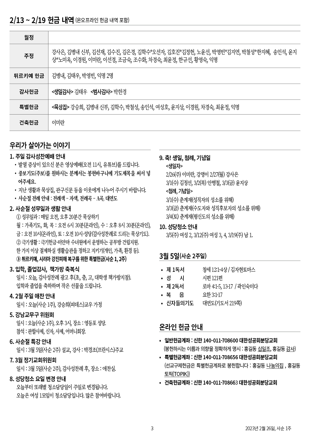 교회 주보 사순 1주일 by 분당교회 2023. 2. 26. 2023년 2월 26일 사순 1주일 교회주보 공유하기 게시글 관리 대한성공회 분당교회 '교회 주보' 카테고리의 다른 글 사순 3주일 (0) 2023.03.12 사순2주일 (0) 2023.03.05 연중 7주일 교회주보 (0) 2023.02.19 연중 6주일 (0) 2023.02.12 연중 5주일 (0) 2023.02.12 관련글 사순 3주일 사순2주일 연중 7주일 교회주보 연중 6주일 댓글