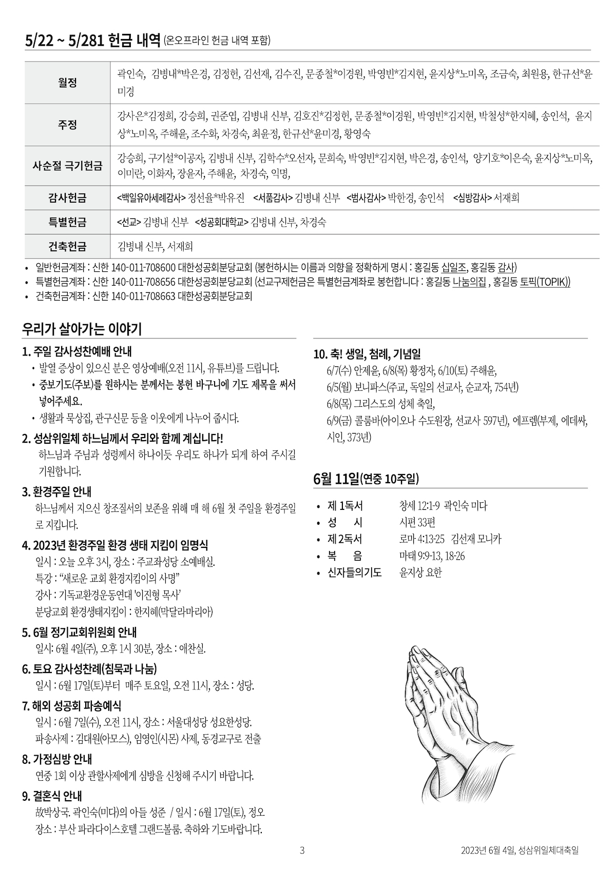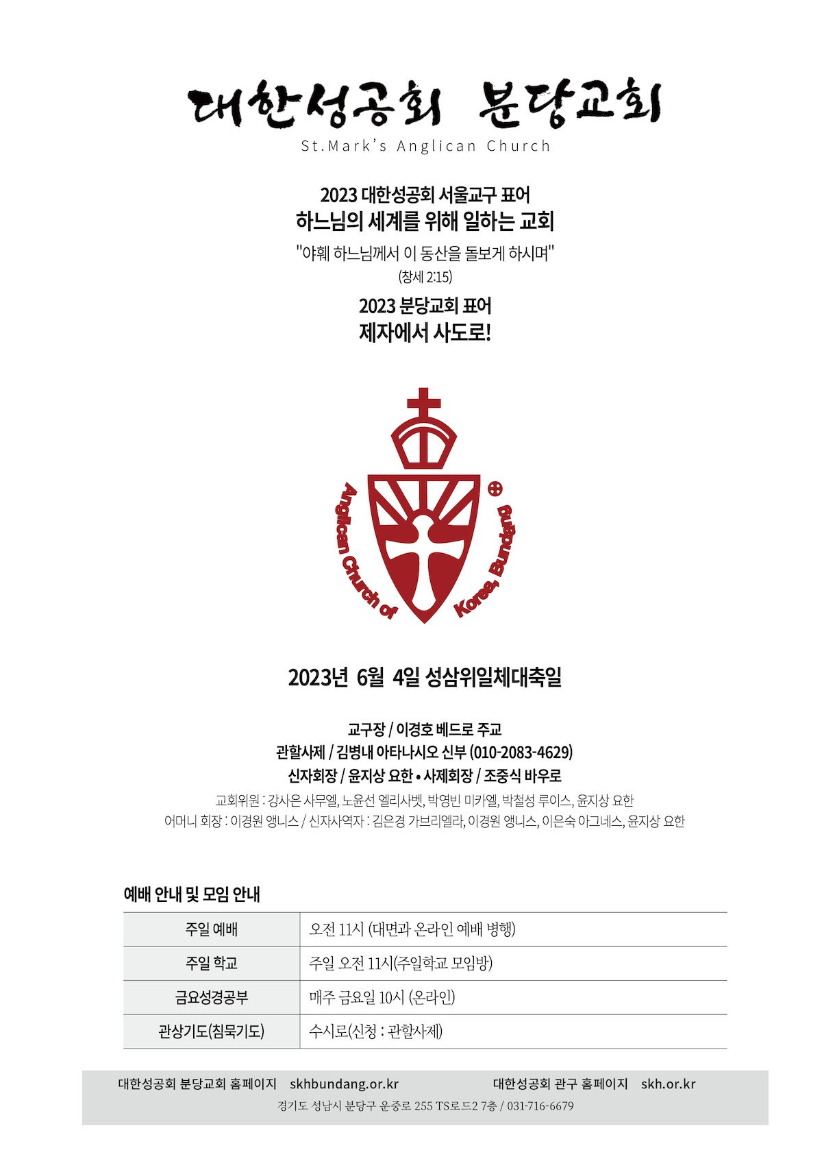 교회 주보 성삼위일체대축일 by 분당교회 2023. 6. 4. 2023년 6월 4일 성삼위일체대축일 교회주보 공유하기 게시글 관리 대한성공회 분당교회 '교회 주보' 카테고리의 다른 글 연중 11주일 (0) 2023.06.18 연중 10주일 (0) 2023.06.11 성령강림대축일 (0) 2023.05.28 승천대축일 (0) 2023.05.21 부활 6주일 (0) 2023.05.14 관련글 연중 11주일 연중 10주일 성령강림대축일 승천대축일 댓글