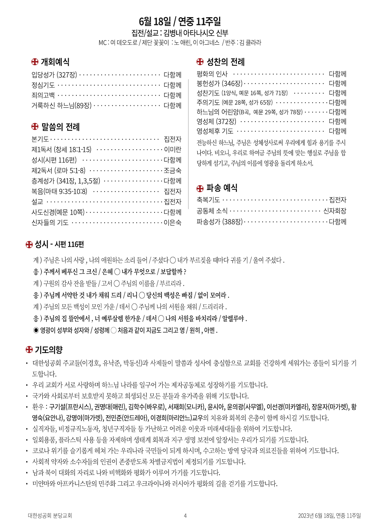 교회 주보 연중 11주일 by 분당교회 2023. 6. 18. 2023년 6월 18일 연중 11주일 성공회 분당교회 교회주보 공유하기 게시글 관리 대한성공회 분당교회 '교회 주보' 카테고리의 다른 글 맥추감사주일 (0) 2023.07.02 연중 12주일 (0) 2023.06.25 연중 10주일 (0) 2023.06.11 성삼위일체대축일 (0) 2023.06.04 성령강림대축일 (0) 2023.05.28 관련글 맥추감사주일 연중 12주일 연중 10주일 성삼위일체대축일 댓글