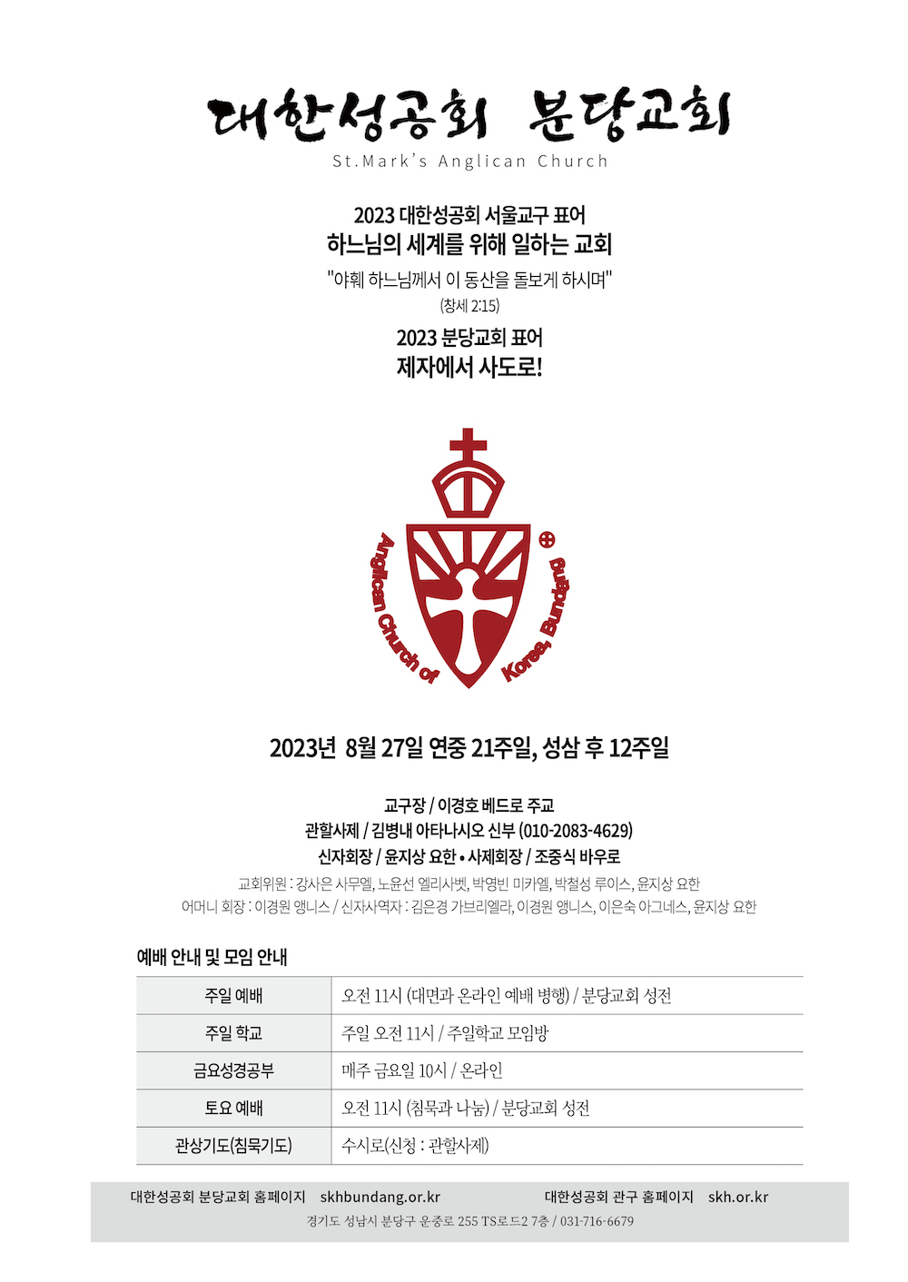 교회 주보 연중 21주일 by 푸드라이터 2023. 8. 27. 2023년 08월 27일 연중 21주일 성삼 후 12주일 성공회 분당교회 교회주보 공유하기 게시글 관리 대한성공회 분당교회 '교회 주보' 카테고리의 다른 글 연중 24주일 (0) 2023.09.17 연중 23주일 (0) 2023.09.10 연중 20주일 (0) 2023.08.20 평화통일주간 (0) 2023.08.13 주의 변모 주일 (0) 2023.08.06 관련글 연중 24주일 연중 23주일 연중 20주일 평화통일주간 댓글
