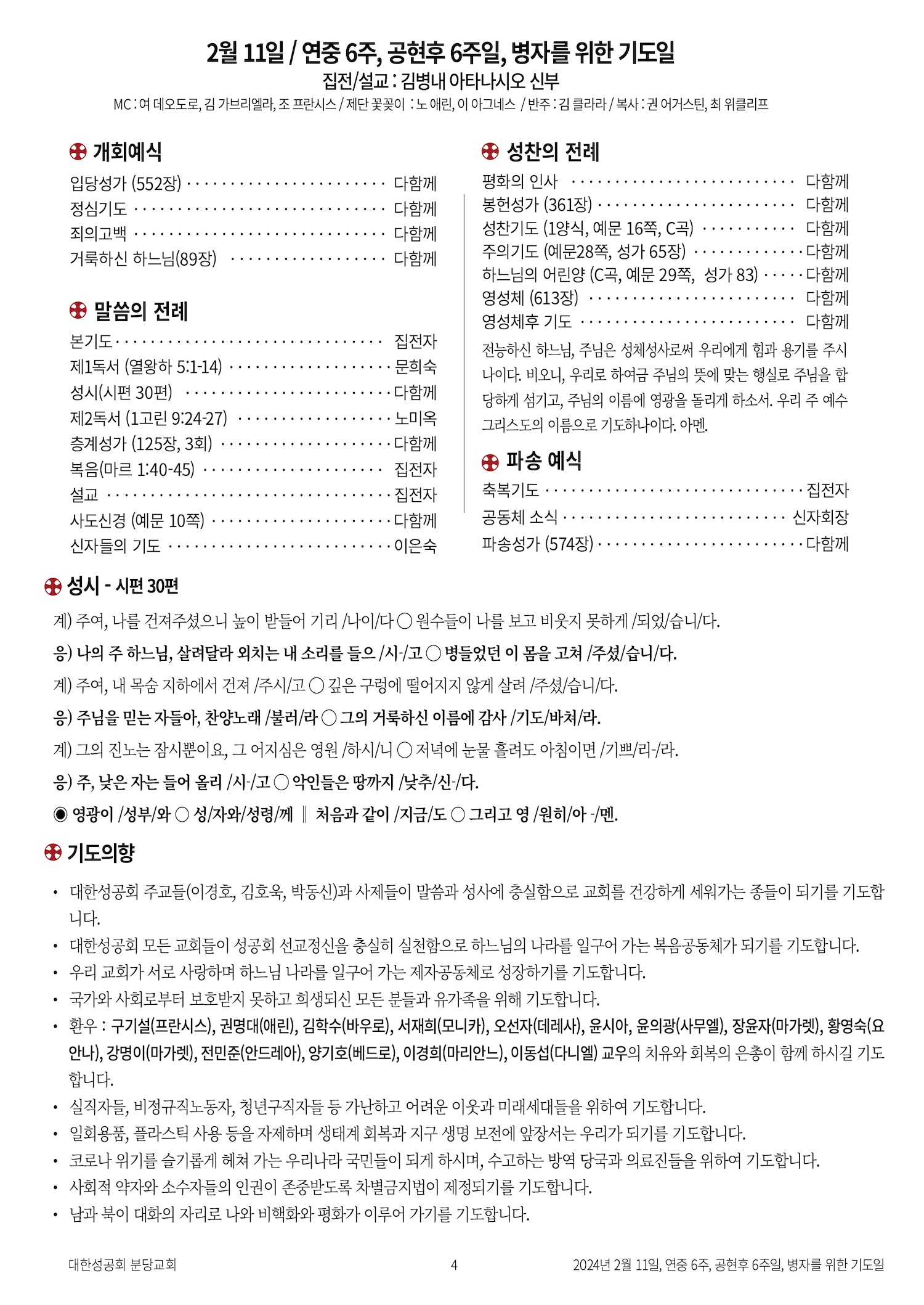 교회 주보 연중 6주일 by 분당교회 2024. 2. 11. 2024년 2월 11일 연중 6주일 / 공현후 6주일 병자를 위한 기도일 공유하기 게시글 관리 대한성공회 분당교회 '교회 주보' 카테고리의 다른 글 사순 2주일 (0) 2024.02.25 사순 1주일 (0) 2024.02.18 연중 5주일 (0) 2024.02.04 연중 4주일 (0) 2024.01.28 연중 3주일 (0) 2024.01.21 관련글 사순 2주일 사순 1주일 연중 5주일 연중 4주일 댓글