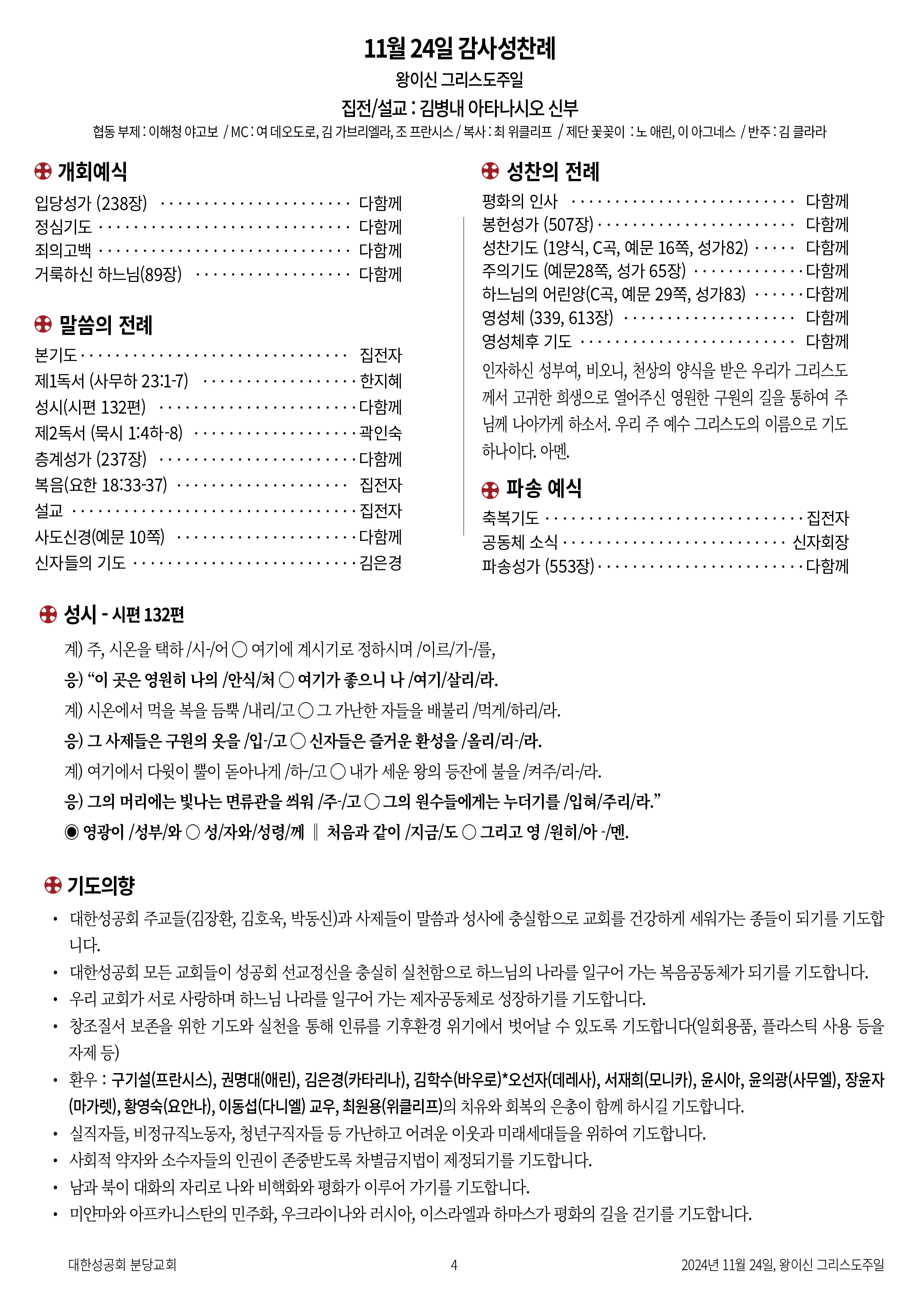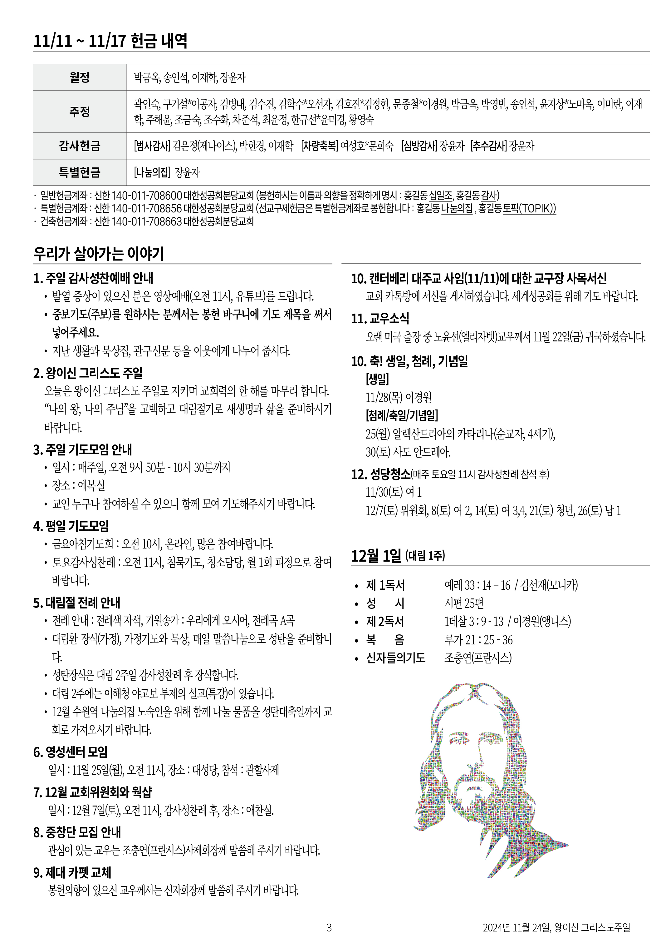 교회 주보 왕이신 그리스도주일 by 분당교회 2024. 11. 24. 2024년 11월 24일 왕이신 그리스도주일 공유하기 게시글 관리 대한성공회 분당교회 '교회 주보' 카테고리의 다른 글 대림2주일 (0) 2024.12.08 대림 1주일 (0) 2024.12.01 연중 33주일 (0) 2024.11.17 추수감사절 (0) 2024.11.10 연중 31주일 (0) 2024.11.03 관련글 대림2주일 대림 1주일 연중 33주일 추수감사절 댓글