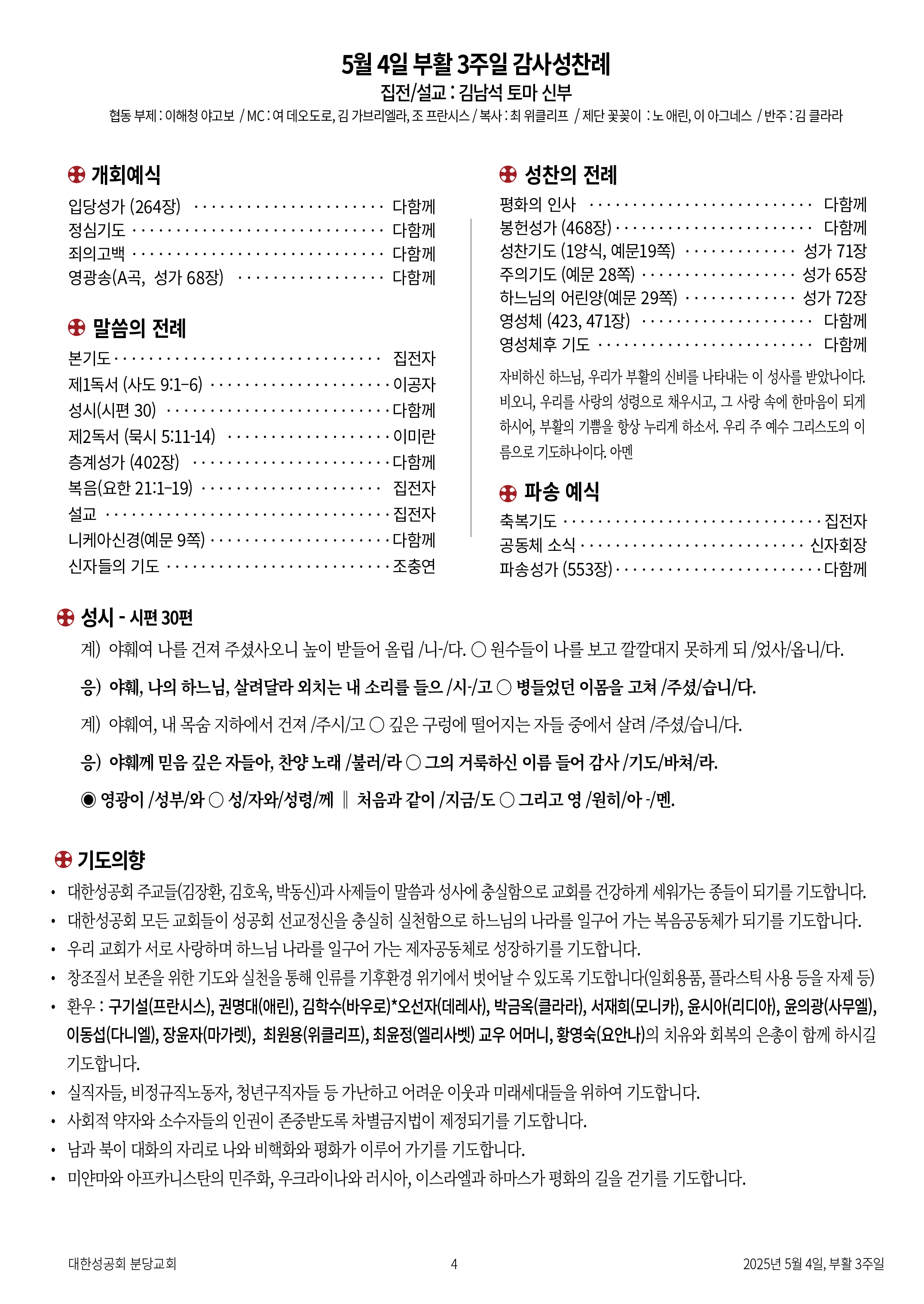교회 주보 부활 3주일 by 분당교회 2025. 5. 4. 2025년 5월 4일 부활 3주일 공유하기 게시글 관리 대한성공회 분당교회 '교회 주보' 카테고리의 다른 글 부활 5주일 (0) 2025.05.18 부활 4주일 (0) 2025.05.11 부활2주일 (0) 2025.04.27 부활대축일 (0) 2025.04.20 성지/고난주일 (0) 2025.04.13 관련글 부활 5주일 부활 4주일 부활2주일 부활대축일 댓글