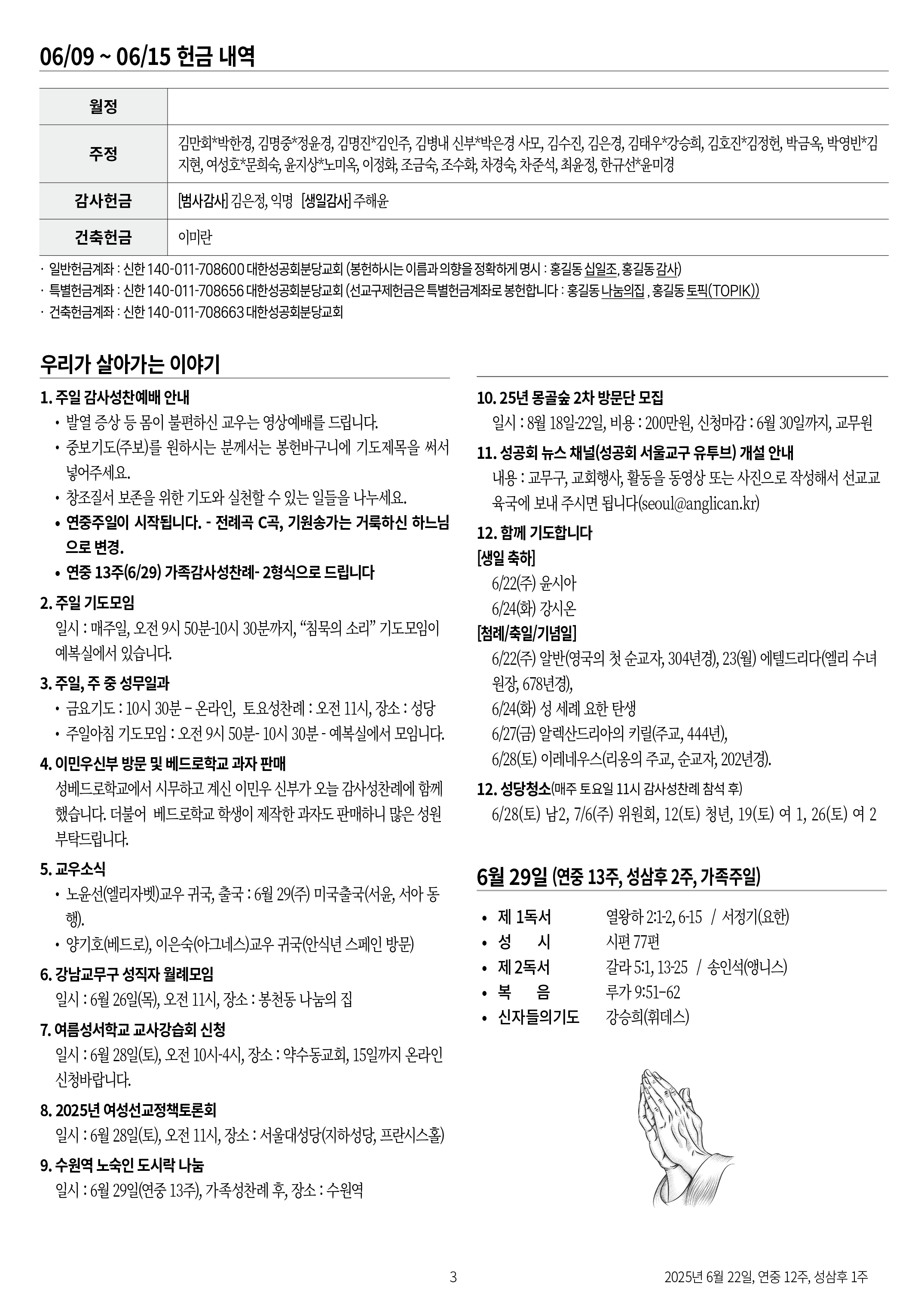 교회 주보 연중 1주 by 푸드라이터 2025. 6. 22. 2025년 6월 22일 연중 1주 / 성삼후 1주 공유하기 게시글 관리 대한성공회 분당교회 '교회 주보' 카테고리의 다른 글 맥추감사주일 (0) 2025.07.06 가족주일(연중 13주) (0) 2025.06.29 성삼위일체대축일 (0) 2025.06.15 성령강림대축일 (0) 2025.06.08 부활 7주일 (1) 2025.06.01 관련글 맥추감사주일 가족주일(연중 13주) 성삼위일체대축일 성령강림대축일 댓글