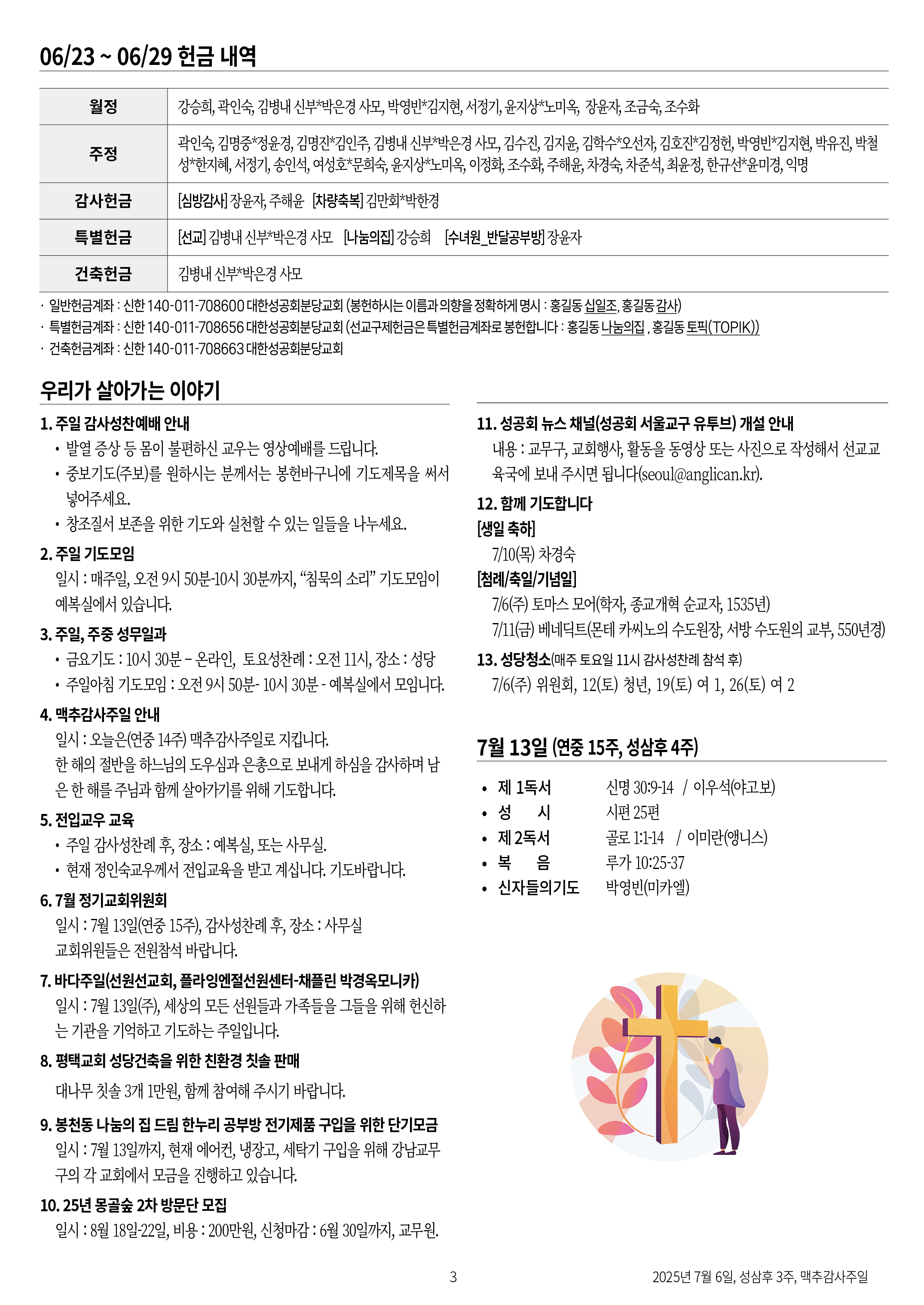 교회 주보 맥추감사주일 by 푸드라이터 2025. 7. 6. 2025년 7월 6일 맥추감사주일 성삼후 3주 공유하기 게시글 관리 대한성공회 분당교회 '교회 주보' 카테고리의 다른 글 연중 16주 (0) 2025.07.20 연중 15주 (0) 2025.07.13 가족주일(연중 13주) (0) 2025.06.29 연중 1주 (0) 2025.06.22 성삼위일체대축일 (0) 2025.06.15 관련글 연중 16주 연중 15주 가족주일(연중 13주) 연중 1주 댓글