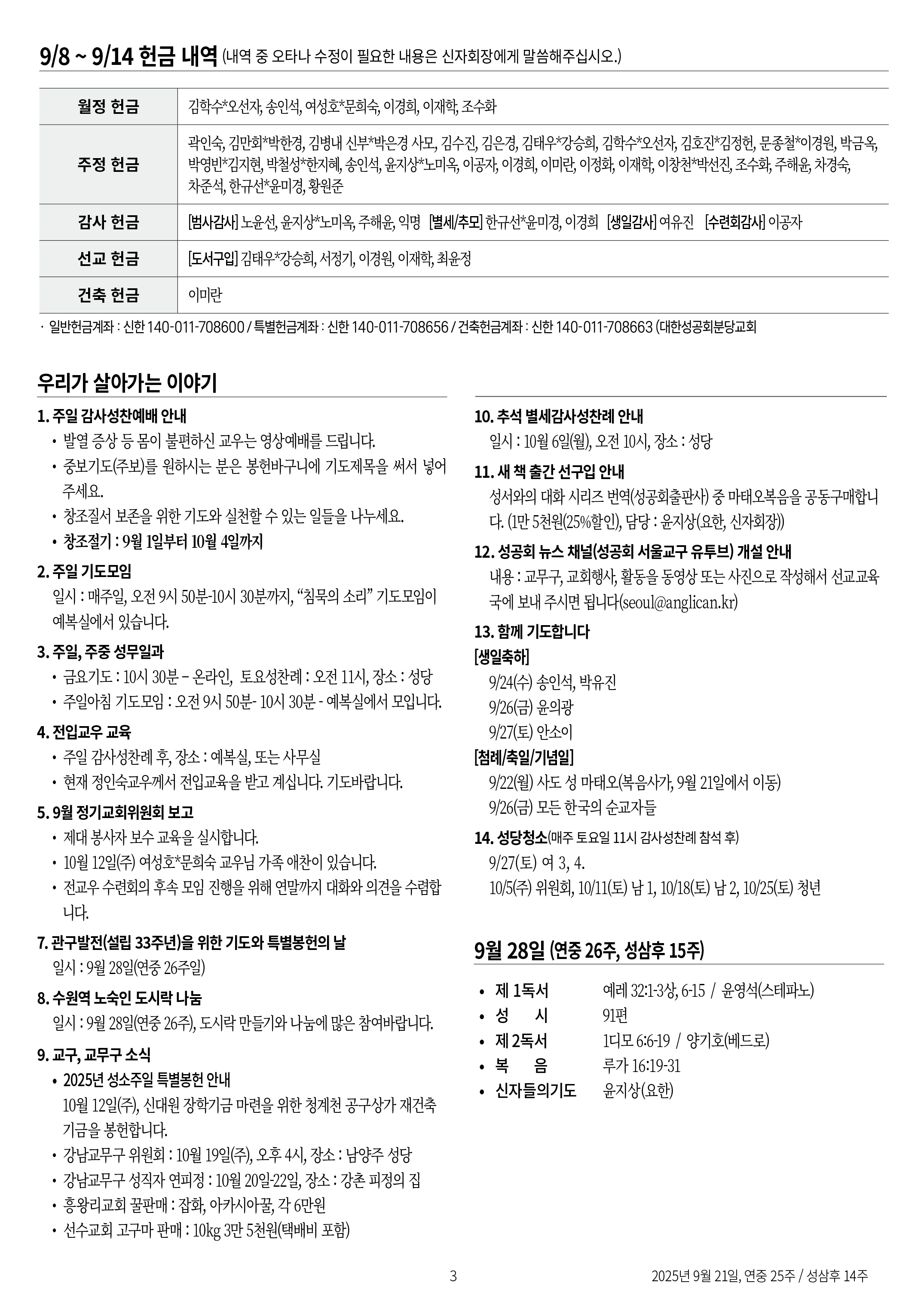 교회 주보 연중 25주 by 분당교회 2025. 9. 21. 2025년 9월 21일 연중 25주 / 성삼후 14주 공유하기 게시글 관리 대한성공회 분당교회 '교회 주보' 카테고리의 다른 글 연중 27주 (0) 2025.10.05 관구설립 33주년 (0) 2025.09.28 연중 24주 (0) 2025.09.14 연중 23주 (0) 2025.09.07 연중 22주 (0) 2025.08.31 관련글 연중 27주 관구설립 33주년 연중 24주 연중 23주 댓글