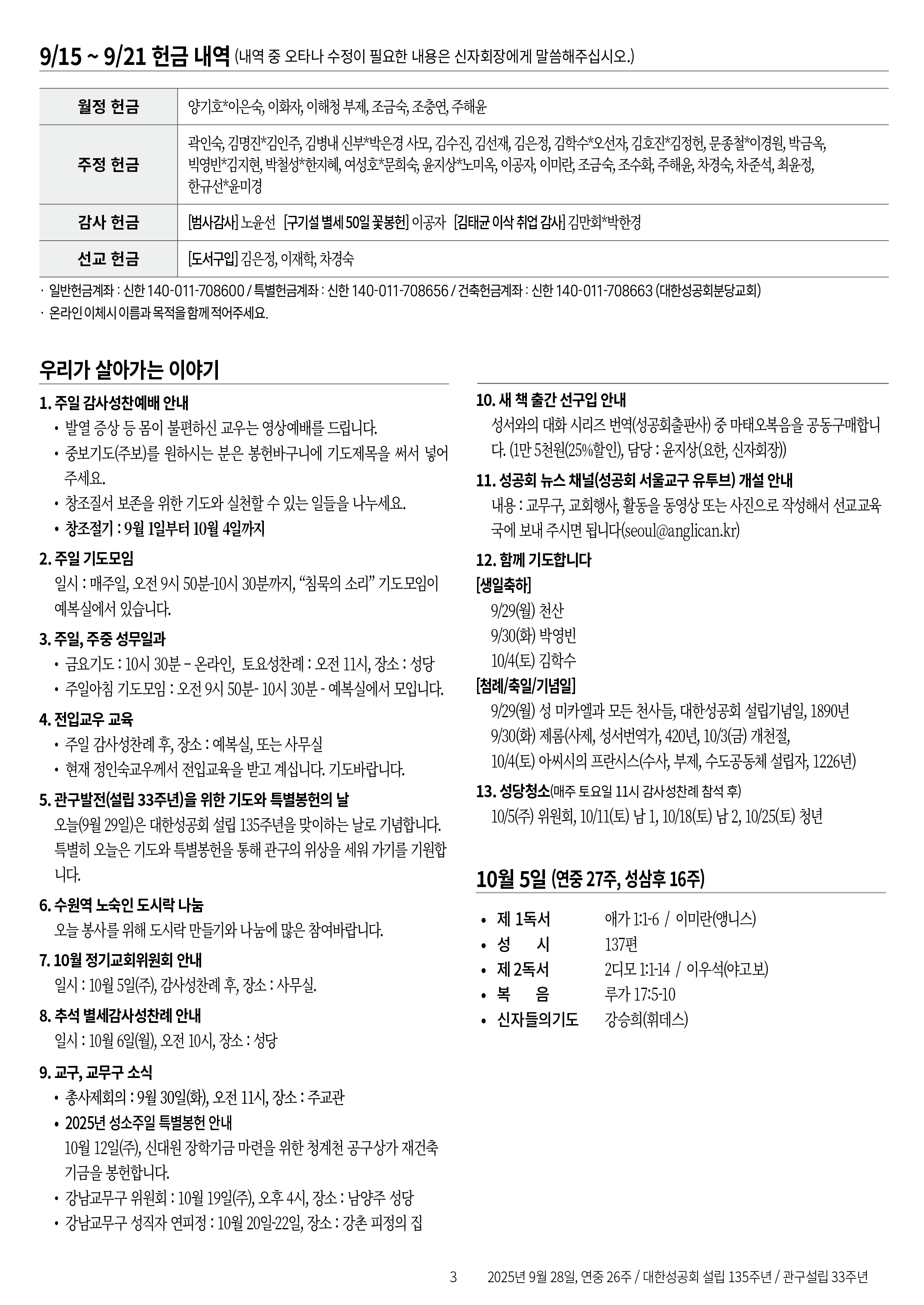 교회 주보 관구설립 33주년 by 분당교회 2025. 9. 28. 2025년 9월 28일 연중 26주 / 성삼후 15주 대한성공회 설립 135주년 관구설립 33주념 공유하기 게시글 관리 대한성공회 분당교회 '교회 주보' 카테고리의 다른 글 성소주일, 연중 28주 (0) 2025.10.12 연중 27주 (0) 2025.10.05 연중 25주 (0) 2025.09.21 연중 24주 (0) 2025.09.14 연중 23주 (0) 2025.09.07 관련글 성소주일, 연중 28주 연중 27주 연중 25주 연중 24주 댓글