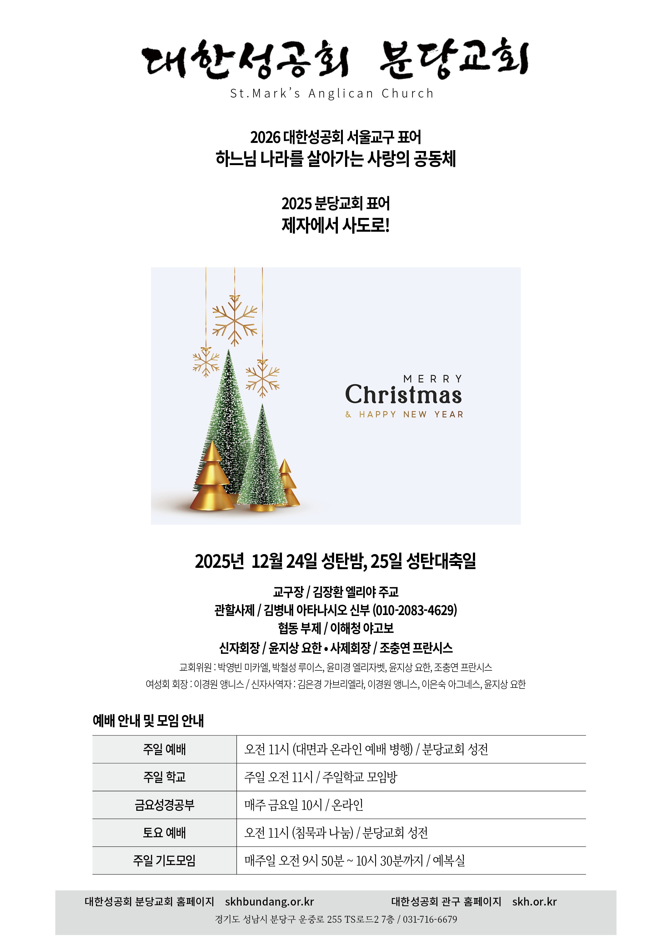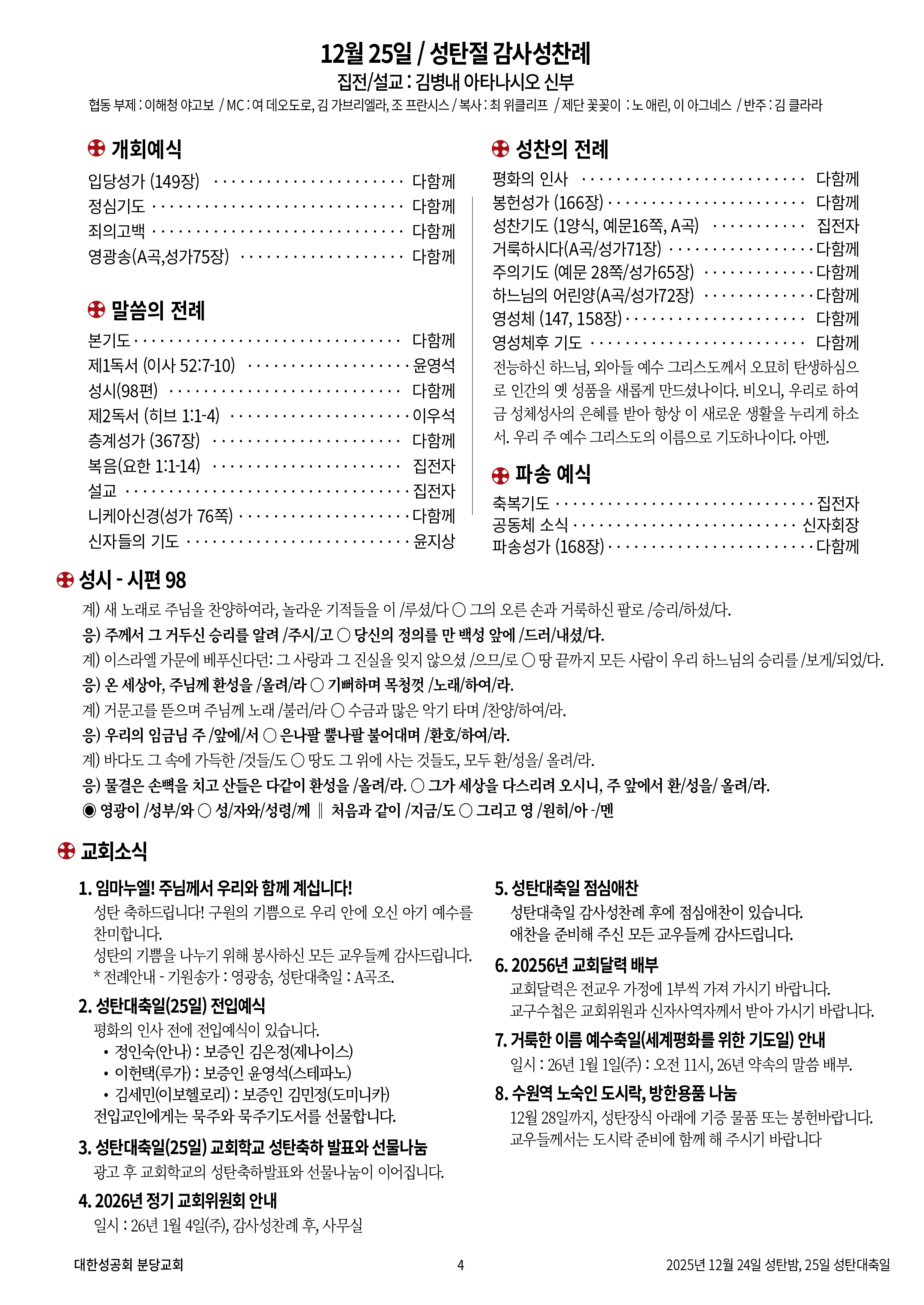 교회 주보 성탄전야, 성탄절 by 분당교회 2025. 12. 24. 2025년 12월 24일, 25일 성탄전야, 성탄절 공유하기 게시글 관리 대한성공회 분당교회 '교회 주보' 카테고리의 다른 글 주님의 세례 (0) 2026.01.11 성탄 후 1주 (0) 2025.12.28 대림 4주 (0) 2025.12.21 대림 3주 (0) 2025.12.14 대림 2주 (0) 2025.12.07 관련글 주님의 세례 성탄 후 1주 대림 4주 대림 3주 댓글