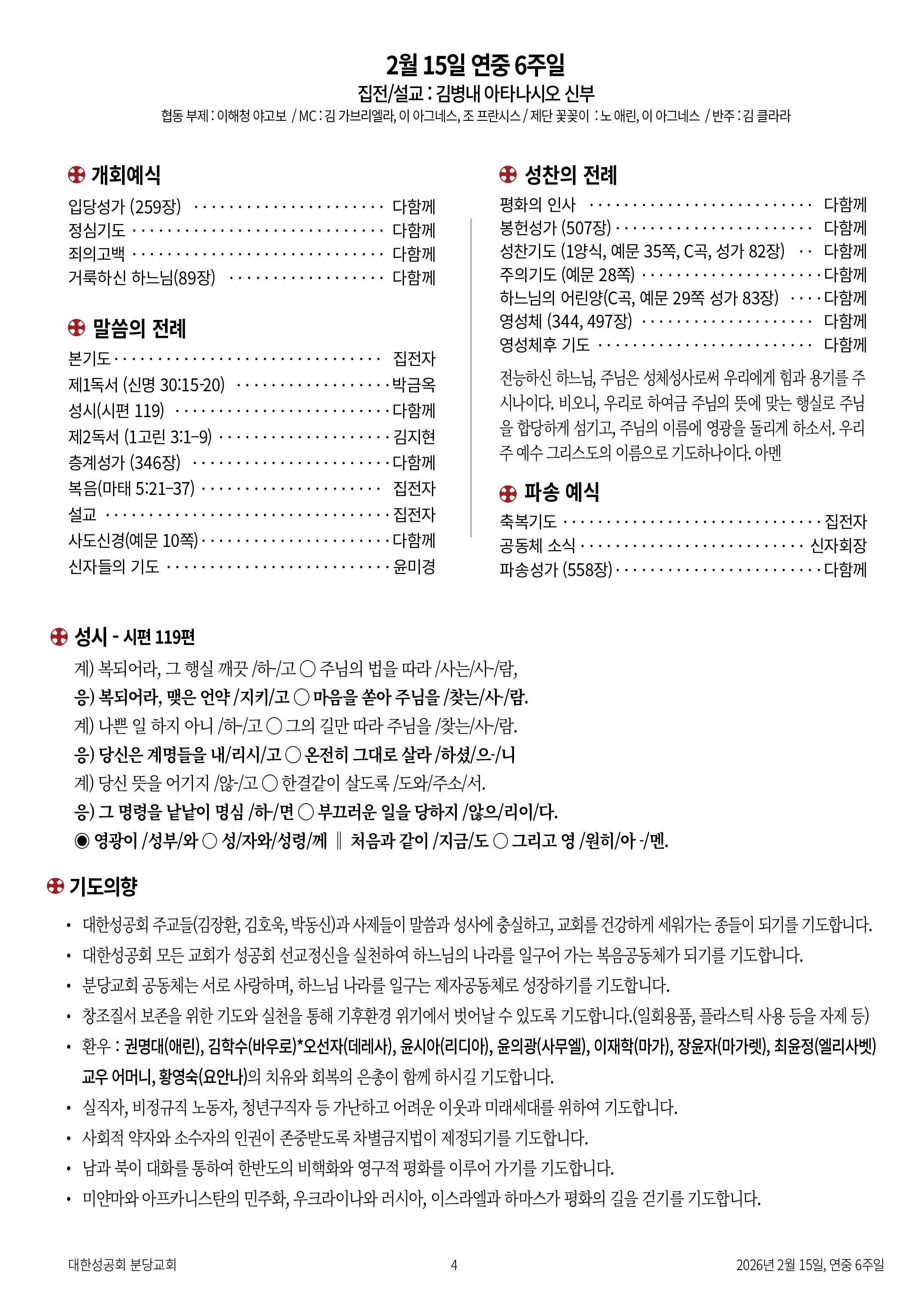 교회 주보 연중 6주일 by 분당교회 2026. 2. 15. 2026년 2월 15일 연중 6주일 공유하기 게시글 관리 대한성공회 분당교회 '교회 주보' 카테고리의 다른 글 연중 5주일 (0) 2026.02.09 주의 봉헌 (0) 2026.02.01 연중 3주 (0) 2026.01.25 연중 2주 (0) 2026.01.18 주님의 세례 (0) 2026.01.11 관련글 연중 5주일 주의 봉헌 연중 3주 연중 2주 댓글