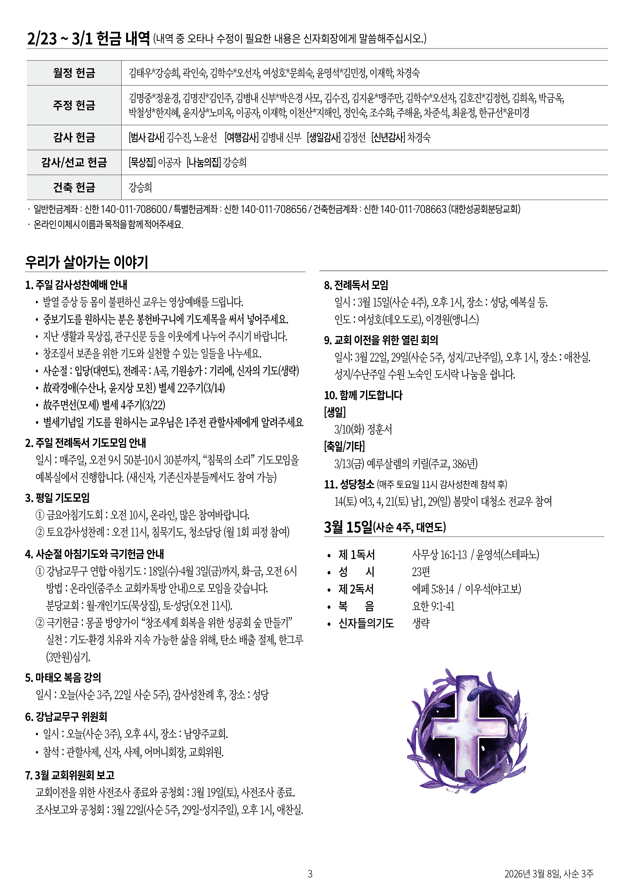 교회 주보 사순 3주 by 분당교회 2026. 3. 9. 2026년 3월 8일 사순 3주 공유하기 게시글 관리 대한성공회 분당교회 '교회 주보' 카테고리의 다른 글 사순 5주 (0) 2026.03.22 사순 4주 (0) 2026.03.15 사순 2주일 (0) 2026.03.02 사순 1주 (0) 2026.02.22 연중 6주일 (0) 2026.02.15 관련글 사순 5주 사순 4주 사순 2주일 사순 1주 댓글
